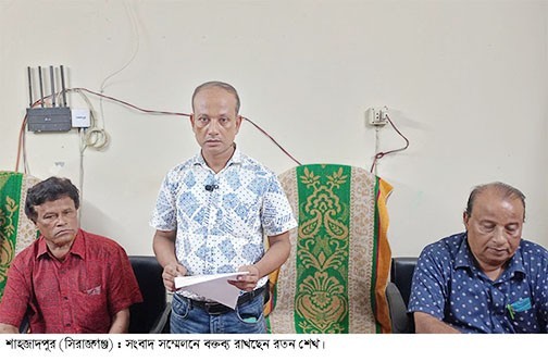 শাহজাদপুরে ১৬ বছর আগের হামলা ও মারপিটের ঘটনায় দায়েরকৃত একটি মামলায় আসামী করার প্রতিবাদে সংবাদ সম্মেলন করেছেন ক্রাউন ওয়্যারস প্রাইভেট লিমিটেডের প্রশাসন ও মানবস¤পদ কর্মকর্তা শাহজাদপুর পৌর এলাকার দ্বারিয়াপুর মহল্লার রতন শেখ।