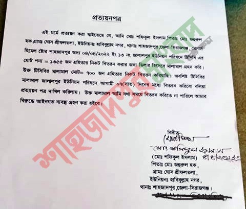 মেসার্স হিমেল ষ্টোর এর জামাতা ও মেসার্স হাফিজা ষ্টোরের ডিলার শফিকুল ইসলামের স্বাক্ষরিত প্রত্যয়ন পত্র/ মুচলেকা