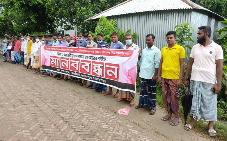 সিরাজগঞ্জের শাহজাদপুর উপজেলার কৈজুরি ইউনিয়নের গোপালপুর গ্রামেরর শাহজাদপুর-পাচিল সড়কে মঙ্গলবার বেলা ১১টার দিকে ৩ শতাধিক মানুষের বিরুদ্ধে নানা অজুহাতে ১০টি মিথ্যা মামলা দায়েরের প্রতিবাদে গ্রামবাসি আধাঘন্টা ব্যাপী মানববন্ধন ও সংবাদ সম্মেলনের আয়োজন করে।