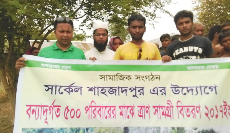 বৃহস্পতিবার সকালে শাহজাদপুর উপজেলার যমুনা নদী তীরবর্তী সোনাতুনী ইউনিয়নের প্রত্যান্ত অঞ্চল ও ভয়াবহ বন্যা কবলিত দুর্গম চরাঞ্চলের ৫ 'শ অসহায়, দুস্থ বানভাসীদের মাঝে আজ সকালে ত্রান বিতরন করা হয়েছে । গ্রুপের নেতৃবৃন্দকে সাথে নিয়ে বন্যাদুর্গত চরাঞ্চলের ৫'শ দুস্থদের হাতে ত্রান বিতরন করা হয়। বিতরণে উপস্থিত ছিলেন গ্রুপ নির্বাহী ও সভাপতি রাজীব রাসেল । আরো উপস্তিত ছিলেন সাধারন সম্পাদক ও এডমিন ফারুক হাসান কাহার, এডমিন শামছুর রহমান শিশির, এম এ হান্নান শেখ গ্রুপের সদস্য মনোয়ার সাব্বির, জুয়েল, শরিফ, রাসেদুল । ত্রাণ বিতরণ প্রসঙ্গে সার্কেল শাহজাদপুরের সভাপতি রাজীব রাসেল বলেন, অামরা সবমসময় অসহায় জনগোষ্ঠীর সব ধরনের সহযোগিতা করে থাকি । গত বছরের ন্যায় আমরা এ বছর ও বানভাসীদের মাঝে ত্রান বিতরন করলাম । পরবর্তীতে আমরা শুধু শাহজাদপুর নয় বাংলাদেশের বিভিন্ন জেলায় যেখানে বন্যা, খরাসহ যেকোনো ধরনের প্রাকৃতিক দুর্যোগ হলে সার্কেল শাহজাদপুরের পক্ষ থেকে ক্ষতিগ্রস্ত মানুষের পাশে গিয়ে দাঁড়ানোর চেষ্টা করবো। সাধারন সম্পাদক ও এডমিন ফারুক হাসান কাহার বলেন, মানুষের সেবা করার সুযোগ পেয়ে রাব্বুল আলামিনের কাছে অশেষ শুকরিয়া জানাচ্ছি। সকলের সহযোগিতায় আমরা ত্রাণ পৌঁছে দিতে পেরেছি। অনেকের কাছেই আমাদের হাত পেতে চাইতে হয়েছে, নিজের জন্য নয়, মানবতার জন্য। আল্লাহর অশেষ রহমতে অনেকেই আমাদের সহযোগিতার হাত বাড়িয়ে দিয়েছে। আমরা এখানে যে ত্রাণ নিয়ে গিয়েছি তা যেন তাদের কষ্টময় জীবনের কাছে কিছুই না। তাই সমাজের সকলের কাছে অনুরোধ, যার যার সামর্থ মত যেন তাদের পাশে দাঁড়াতে পারেন।