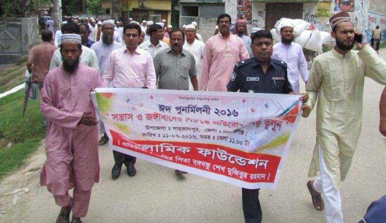 শাহজাদপুর উপজেলা সংবাদদাতা : শাহজাদপুরে ইসলামিক ফাউন্ডেশনের উদ্যোগে সন্ত্রাস ও জঙ্গিবাদের বিরুদ্ধে র্যালি ও আলোচনা সভা অনুষ্ঠিত হয়েছে। আজ সোমবার এ উপলক্ষে পৌর এলাকার বিভিন্ন সড়কে র্যালিটি প্রদক্ষিণ করে। পরে উপজেলা পরিষদের শহিদ স্মৃতি মিলনায়তনে এক আলোচনা সভা অনুষ্ঠিত হয়। উপজেলা নির্বাহী অফিসার শামীম আহমেদের সভাপতিত্বে অনুষ্ঠিত ওই সভায় অন্যান্যের মধ্যে বক্তব্য রাখেন, উপজেলা পরিষদের চেয়ারম্যান প্রফেসর আজাদ রহমান, ভাইস চেয়ারম্যান মুস্তাক আহমেদ, সহকারী কমিশনার (ভূমি) মোঃ আরিফুজ্জামান, থানার অফিসার ইনচার্জ রেজাউল হক, ইসলামিক ফাউন্ডেশানের ফিল্ড সুপারভাইজার হাসিবুর রহমান, ইসলামিক ফাউন্ডেশনের মডেল কেয়ারটেকার মনসুর রহমান প্রমূখ।