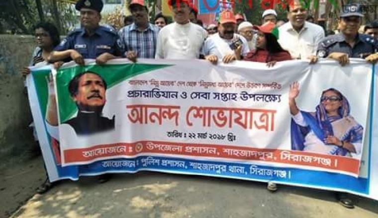 নিজস্ব প্রতিবেদক: স্বল্পোন্নত দেশ থেকে উন্নয়নশীল দেশের স্বীকৃতি অর্জনের ঐতিহাসিক সাফল্য উদযাপন উপলক্ষে আজ বৃহস্পতিবার (২২ মার্চ) সারাদেশের মতো শাহজাদপুরেও আনন্দ শোভাযাত্রা বের হয়। এদিন সকালে শাহজাদপুর উপজেলা প্রশাসন আয়োজিত আনন্দ শোভাযাত্রা উপজেলা পরিষদ চত্বর থেকে বের হয়ে পৌরসদরের গুরুত্বপূর্ণ সড়ক প্রদক্ষিণ শেষে উপজেলা পরিষদ চত্বরে গিয়ে শেষ হয়। শাহজাদপুর উপজেলা নির্বাহী অফিসার শেহেলী লায়লার সভাপতিত্বে বের হওয়া আনন্দ শোভাযাত্রায় প্রধান অতিথি হিসেবে অংশ নেন স্থানীয় সংসদ সদস্য আলহাজ্ব হাসিবুর রহমান স্বপন । ওই আনন্দ শোভাযাত্রায় অন্যান্যের মধ্যে অংশ নেন, শাহজাদপুর উপজেলা পরিষদ চেয়ারম্যান প্রফেসর আজাদ রহমান, শাহজাদপুর সরকারি কলেজের অধ্যক্ষ ড.আব্দুস সাত্তার, সাবেক অধ্যক্ষ এএম আব্দুল আজীজ, ভাইস চেয়ারম্যান মুস্তাক আহম্মেদ, উপজেলা আওয়ামী লীগের যুগ্ন-সাধারণ সম্পাদক ও কৈজুরী ইউনিয়ন পরিষদ চেয়ারম্যান সাইফুল ইসলাম, শাহজাদপুর থানার অফিসার ইনচার্জ মোঃ খাজা গোলাম কিবরিয়া, পৌর আওয়ামী লীগের সাধারণ সম্পাদক আমিরুল ইসলাম শাহু প্রমূখ । আনন্দ শোভাযাত্রায় উপজেলার বিভিন্ন শিক্ষা প্রতিষ্ঠান, রাজনৈতিক, সামাজিক, সায়ত্বশাষিত সংগঠনের নেতৃবৃন্দ ও সদস্যগণ স্বতস্ফূর্তভাবে অংশগ্রহন করে।