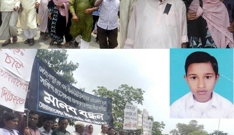 উল্লাপাড়া প্রতিনিধিঃ উল্লাপাড়ার স্কুল ছাত্র সাকিব হত্যার প্রতিবাদে গতকাল মঙ্গলবার উপজেলার লাহিড়ীমোহনপুর কে.এম ইন্সষ্টিটিউটের শিক্ষাথী, শিক্ষক, ব্যবস্থাপনা কমিটির সদস্য ও অভিভাবকবৃন্দ মোহনপুর-তালগাছী আঞ্চলিক সড়কে মানববন্ধ, বিক্ষোভ মিছিল ও স্কুল চত্ত্বরে প্রতিবাদ সভার আয়োজন করে। স্কুল কমিটির সভাপতি হাবিবুর রহমান বাঁশির সভাপতিত্বে প্রতিবাদ সমাবেশে স্কুলের প্রধান শিক্ষক আব্দুল হান্নান, কমিটির সদস্য শাহাদত হোসেন জিকো, জমসের আলী, নিহত সাকিবের বাবা গোলাম মোস্তফা, সহকারী শিক্ষক আব্দুল আলীম, আব্দুল হালিম, আওয়ামীলীগ নেতা উত্তম কুমার কুন্ডু প্রমুখ বক্তব্য রাখেন। সভায় বক্তারা এই হত্যাকান্ডের তীব্র নিন্দা ও প্রতিবাদ জানিয়ে হত্যাকারীদের দৃষ্টান্তমূলক শাস্তির দাবি করেন। পরে স্কুল চত্ত্বরে সাকিবের রুহের মাগফিরাত কামনা করে দোয়া মাহফিল অনুষ্ঠিত হয়।