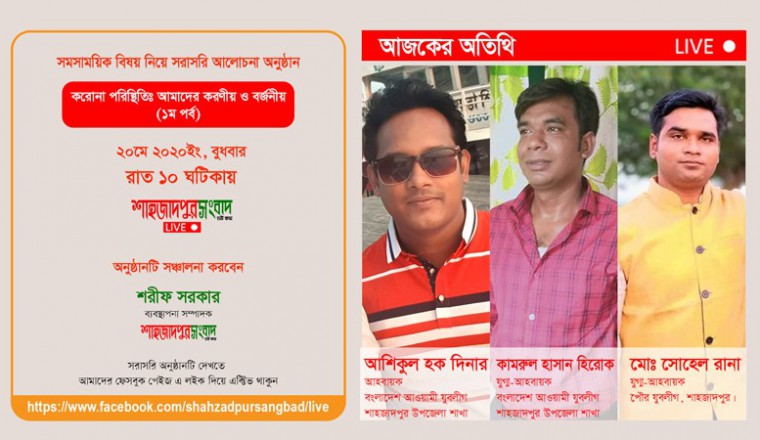 শাহজাদপুর সংবাদ ডটকম এর বিশেষ ধারাবাহিক আয়োজনের প্রথম পর্বে “করোনা পরিস্থিতিঃ আমাদের করণীয় ও বর্জনীয়” প্রসঙ্গত অনুষ্ঠানটি সরাসরি সম্প্রচারিত হবে শাহজাদপুর সংবাদ ডটকম এর অফিসিয়াল ফেসবুক পেইজ (https://www.facebook.com/shahzadpursangbad) এ আজ  ২০মে বুধবার রাত ১০ ঘটিকায়। আলোচনা অনুষ্ঠানে অংশগ্রহন করবেন, শাহ্জাদপুর উপজেলা যুবলীগ এর আহবায়ক আশিকুল হক দিনার, যুগ্ম-আহবায়ক কামরুল হাসান হিরোক এবং শাহজাদপুর পৌর যুবলীগ এর যুগ্ম-আহবায়ক, সোহেল রানা। সঞ্চালক হিসেবে থাকবেন- মোঃ শরীফ সরকার, ব্যবস্থাপনা সস্পাদক, শাহজাদপুর সংবাদ ডটকম। অনুষ্ঠানটি সরাসরি দেখতে নিচের যেকোন লিংক-এ ক্লিক করুন https://www.facebook.com/shahzadpursangbad/live https://www.shahzadpursangbad.com/live উল্লেখ্য গত শুক্রবার ১৫ মে ২০২০ইং রাত ১০:১৫মিনিটে শাহজাদপুর সংবাদ ডটকম প্রথমবারের মতো সরাসরি অনুষ্ঠান আয়োজন করে।