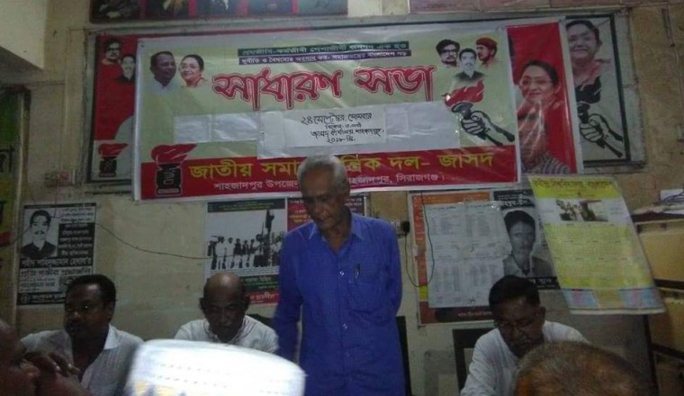 শাহজাদপুর সংবাদ ডটকম, নিজস্ব প্রতিবেদক, বুধবার, ২৬ সেপ্টেম্বর - ২০১৮ খ্রিষ্টাব্দ : গত সোমবার বিকেলে জাতীয় সমাজতান্ত্রিক দল-জাসদ, শাহজাদপুর উপজেলা কমিটির সাধারণ সভা দলের স্থানীয় কার্যালয়ে অনুষ্ঠিত হয়েছে। শাহজাদপুর উপজেলা জাসদ সভাপতি শফিকুজ্জামান শফির সভাপতিত্বে অনুষ্ঠিত ওই সভায় প্রধান অতিথির বক্তব্য রাখেন, জাসদ কেন্দ্রীয় কমিটির সাবেক দফতর সম্পাদক, বিশিষ্ট সাংবাদিক ও লেখক, মুক্তিযোদ্ধা সাইফুল ইসলাম। সভায় জাসদ কেন্দ্রীয় কমিটির সদস্য ও সিরাজগঞ্জ জেলা জাসদের সহ-সভাপতি আবু বকর ভূঁইয়া প্রধান বক্তা হিসেবে বক্তব্য রাখেন। অন্যন্যের মধ্যে আরও বক্তব্য রাখেন, সিরাজগঞ্জ জেলা জাসদের মহিলা বিষয়ক সম্পাদক ও শাহজাদপুর উপজেলা কমিটির সহ-সভাপতি সৈয়দা নাসিমা জামান, শাহজাদপুর উপজেলা জাসদের সাধারণ সম্পাদক আবু হাসান খান মনি, সাংগঠনিক সম্পাদক মোজাম্মেল হক, দফতর সম্পাদক আলতাফ হোসেন (ছানা মাস্টার), পোতাজিয়া ইউনিয়ন পরিষদের সাবেক চেয়ারম্যান, জাসদ নেতা মির্জা আলী আশরাফ বাচ্চু, কায়েমপুর ইউনিয়ন পরিষদের সাবেক চেয়ারম্যান,জাসদ নেতা জহুরুল ইসলাম রানা, শাহজাদপুর পৌর জাসদের সাবেক সাংগঠনিক সম্পাদক ইকবাল হাসান চৌধুরী, উপজেলা শ্রমিক জোট সভাপতি সাইদুল ইসলাম, জাসদ উপজেলা কমিটির কৃষি সম্পাদক আব্দুস ছাত্তার ফকির, কায়েমপুর ইউনিয়ন জাসদ সভাপতি আব্দুল আলীম, জাতীয় যুব জোট শাহজাদপুর উপজেলা কমিটির সাধারণ সম্পাদক মেহেদি হাসান লিটন প্রমূখ। সভায় বর্তমান জাতীয় আন্তর্জাতিক রাজনীতি পরিস্থিতি, একাদশ জাতীয় সংসদ নির্বাচনসহ সাংগঠনিক বিষয়ে ব্যাপক আলোচনা ও গুরুত্বপূর্ণ সিদ্ধান্ত গ্রহণ করা হয়।