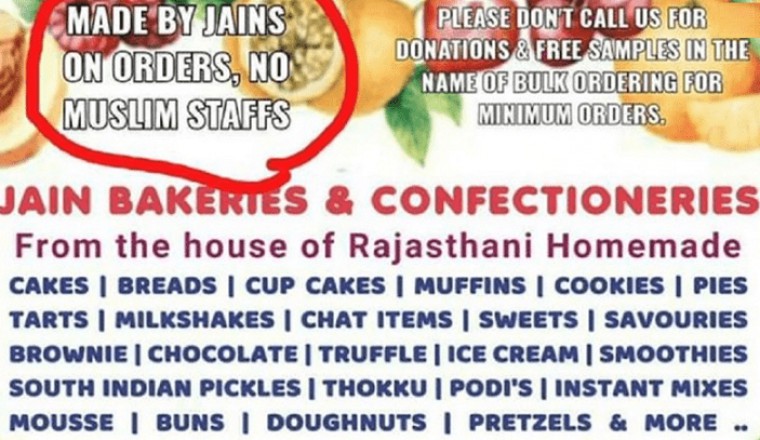 ভারতে মুসলিম বিদ্বেষী চিত্র হর হামেশাই দেখা যায়। সাম্প্রদায়িক উস্কানি দিয়ে দেশটিতে বহু হত্যাকাণ্ড, বাড়িঘর জ্বালিয়ে দেওয়ার ঘটনা ঘটেছে। করোনাভাইরাসের প্রাদুর্ভাবকালেও সাম্প্রদায়িক বর্বরতা চালানোর চেষ্টা করছে এক শ্রেণির মানুষ। ভারতের চেন্নাইয়ে মুসলিম বিদ্বেষের একটি ঘটনা ঘটেছে। ভারতীয় সংবাদমাধ্যম আনন্দবাজার পত্রিকা জানিয়েছে, ‘দোকানে কোনো মুসলিম কর্মচারী নেই’ বিজ্ঞাপন টাঙিয়ে গ্রেপ্তার হয়েছেন এক বেকারি মালিক। ধর্মীয় অবমাননা এবং বিশৃঙ্খলায় প্ররোচনা দেওয়ার অভিযোগে তার বিরুদ্ধে মামলা দায়ের করেছে পুলিশ।