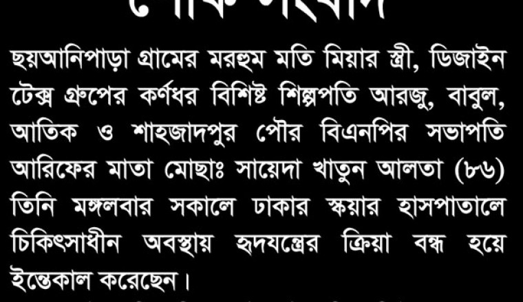 নিজস্ব সংবাদদাতাঃ শাহজাদপুর উপজেলার পৌর সদরের ছয়আনিপাড়া গ্রামের মরহুম কেএম শামছুল ইসলাম মতি মিয়ার স্ত্রী, ডিজাইনটেক্স গ্রুপের কর্ণধর বিশিষ্ট শিল্পপতি কেএম সাইদুল ইসলাম আরজু, কেএম রফিকুল ইসলাম বাবুল, আলহাজ কেএম আতিকুল ইসলাম আতিক ও শাহজাদপুর পৌর বিএনপির সভাপতি কেএম তরিকুল ইসলাম আরিফের মাতা মোছাঃ সায়েদা খাতুন আলতা (৮৬) আজ মঙ্গলবার সকালে ঢাকার স্কয়ার হাসপাতালে চিকিৎসাধিন অবস্থায় হৃদযন্ত্রের ক্রিয়া বন্ধ হয়ে ইন্তেকাল করেছেন। “ইন্না লিল্লাহি ওয়া ইন্না ইলাহি রাজিউন” সকালে এ খবর শাহজাদপুরে এসে পৌছালে এলাকায় শোকের ছায়া নেমে আসে। মৃত্যুকালে তিনি ৪ ছেলে, ৫ মেয়ে, নাতি-নাতনি, আত্মীয়-স্বজন সহ অসংখ্য গুণগ্রাহী রেখে গেছেন। তাঁর প্রথম জানাজার নামাজ আজ বাদ আছর ঢাকার বারিধারার ডিওএইচএস জামে মসজিদে অনুষ্ঠিত হয়। এরপর আগামীকাল বুধবার বাদ ফজর শাহজাদপুরের দরগাহপাড়া মখদুমীয়া জামে মসজিদে দ্বিতীয় জানাজার নামাজ শেষে মখদুমীয়া কবরস্থানে দাফন সম্পন্ন করা হবে।