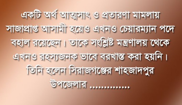 শাহজাদপুর প্রতিনিধিঃ একটি অর্থ আত্মসাৎ ও প্রতারণা মামলায় সাজাপ্রাপ্ত আসামী হয়েও এখনও চেয়ারম্যান পদে বহাল রয়েছেন। তাকে সংশ্লিষ্ট মন্ত্রণালয় থেকে এখনও রহস্যজনক ভাবে বরখাস্ত করা হয়নি। তিনি হলেন সিরাজগঞ্জের শাহজাদপুর উপজেলার কৈজুরী ইউনিয়ন পরিষদের চেয়ারম্যান সাইফুল ইসলাম। আদালত থেকে গ্রেফতারী পরোয়ানা জারি করে (স্মারক নং ২৬৫) শাহজাদপুর থানার ভারপ্রাপ্ত কর্মকর্তা বরারর পাঠানো হলেও পুলিশ তাকে গ্রেফতার করেনি। সাজাপ্রাপ্ত এই ইউপি চেয়ারম্যান সাজা মাথায় নিয়ে প্রকাশ্যে ঘুরে বেড়ালেও তাকে গ্রেফতার না করায় জনমনে নানা প্রশ্ন দেখা দিয়েছে।