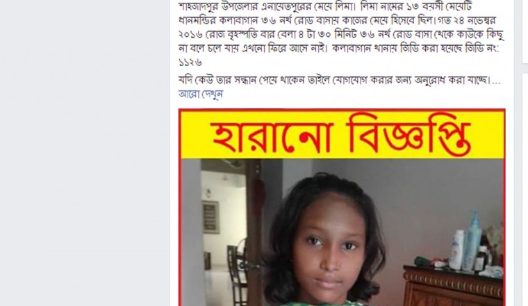 শাহজাদপুর প্রতিনিধি : জনপ্রিয় সামাজিক যোগাযোগ মাধ্যম ফেসবুকে ছবি সম্বলিত ‘হারানো বিজ্ঞপ্তি’ পোস্ট দেয়ায় ঢাকা থেকে ১১ দিন পূর্বে হারিয়ে যাওয়া গৃহপরিচারিকা লিমা (১৩)’র সন্ধান মিলেছে। লিমা গত ২৪ নভেম্বর বিকেলে ঢাকার ৩৬ নর্থরোড এলাকার একটি বাসায় গৃহপরিচারিকার কাজ করাবস্থায় বাড়ির মালিকের ওপর অভিমান করে বাড়ি থেকে বের হয়ে তার গ্রামের বাড়ি শাহজাদপুরের উদ্দেশ্যে রওয়ানা দিয়ে মহাখালী এলাকায় সে হারিয়ে যায়। লিমা সিরাজগঞ্জ জেলার শাহজাদপুর উপজেলার খুকনী যুগীবাড়ি মহল্লার দরিদ্র তাঁতশ্রমিক চাঁন মিয়ার শিশুকন্যা বলে জানা গেছে। এদিকে, বাড়ির মালিক খোঁজাখুঁজি করে তার কোন সন্ধান না পেয়ে ঢাকার কলাবাগান থানায় একটি সাধারণ ডায়েরি করেন। জানা গেছে, স্থানীয় সংবাদকর্মী মামুন বিশ্বাস লিমার হারিয়ে যাওয়ার বিষয়ে জানতে পেরে গত সোমবার ভোরে প্রথমে জেলার ‘আমাদের সিরাজগঞ্জ’ নামের ফেসবুক গ্রুপে তার ছবি সম্বলিত হারানো বিজ্ঞপ্তি পোস্ট করেন। একইদিন সন্ধ্যায় তিনি তার ব্যক্তিগত প্রোফাইলে ১২ জনকে জড়িয়ে করে অপর একটি পোস্ট করেন। ঢাকার মহাখালী এলাকার জনৈক তারেক ফেসবুকের ওই স্ট্যাটাসটি দেখে লিমাকে সিরাজগঞ্জের একটি বাসে তুলে দিলে গতকাল মঙ্গলবার সকাল ৮ টায় লিমা বাড়ি ফেরে। এদিকে, হারিয়ে যাওয়া লিমাকে ফিরে পেয়ে তার স্বজনেরা ‘আমাদের সিরাজগঞ্জ’ ফেসবুক গ্রুপ ও সংবাদকর্মী মামুন বিশ্বাসসহ সংশ্লিষ্টদের প্রতি গভীর কৃতজ্ঞতা প্রকাশ করেন।
