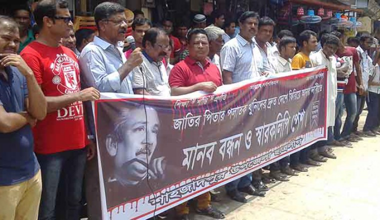 বঙ্গবন্ধুর পলাতক খুনিদের দ্রুত দেশে ফিরিয়ে এনে বিচারের রায় কার্যকরের দাবিতে সিরাজগঞ্জের শাহজাদপুরে মানববন্ধন ও পথসভা অনুষ্ঠিত হয়েছে। গতকাল শনিবার সকালে উপজেলা ছাত্রলীগের আয়োজনে ঘণ্টাব্যাপী এ মানববন্ধন ও পথসভা অনুষ্ঠিত হয়। শাহজাদপুর শহরের মনিরামপুর বাজারের নতুনমাটি থেকে স্থানীয় হাই স্কুল মাঠ পর্যন্ত দীর্ঘ মানববন্ধনে ছাত্রলীগসহ বিভিন্ন শিক্ষাপ্রতিষ্ঠানের সহস্রাধিক শিক্ষার্থী অংশ নেয়। মানববন্ধন চলাকালে ছাত্রলীগ নেতা মাহবুবে ওয়াহিদ শেখ কাজলের সভাপতিত্বে অনুষ্ঠিত পথসভায় বক্তব্য দেন শাহজাদপুর পৌর মেয়র ও সিরাজগঞ্জ জেলা আওয়ামী লীগের সাংগঠনিক সম্পাদক হালিমূল হক মিরু, উপজেলা চেয়ারম্যান প্রফেসর আজাদ রহমান, ভাইস চেয়ারম্যান মুস্তাক আহমেদ, আমিরুল ইসলাম সাহু, গোলাম মওলা আজম, হাসেমআলী, লিয়াকত হোসেন, ছাত্রনেতা ইসলাম শেখ, বিজয় মাহমুদ, নেসারুলহক, আরিফ, আকাশ, প্রতীক, ফারুক প্রমুখ। বক্তারা অবিলম্বে জাতির জনক বঙ্গবন্ধু শেখ মুজিবর রহমানের পলাতক খুনিদের দেশে ফিরিয়ে এনে ফাঁসি কার্যকর করে দেশকে কলঙ্কমুক্ত করার দাবি জানান।