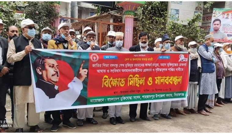 জাতির পিতা বঙ্গবন্ধু শেখ মুজিবুর রহমানের ভাস্কর্য ভাঙচুর, মহান মুক্তিযুদ্ধের চেতনায় আঘাত ও সংবিধান অবমাননাকারীদের দ্রুত গ্রেফতার ও দৃষ্টান্তমূলক শাস্তির দাবীতে মানববন্ধন ও বিক্ষোভ মিছিল অনুষ্ঠিত হয়েছে। শনিবার(১২ডিসেম্বর) দুপুরে সিরাজগঞ্জের শাহজাদপুরে মুক্তিযোদ্ধা সংসদের উদ্যোগে এ মানববন্ধন ও বিক্ষোভ অনুষ্ঠিত হয়। মিছিলটি উপজেলা চত্বর থেকে শুরু হয়ে শহরের বিভিন্ন গুরুত্বপূর্ণ সড়ক প্রদক্ষিণ করে উপজেলা চত্বরে গিয়ে শেষ হয়। এ সময় সংক্ষিপ্ত সমাবেশে বক্তব্য রাখেন শাহজাদপুর উপজেলা আওয়ামী লীগের সাধারণ সম্পাদক ও উপজেলা চেয়ারম্যান প্রফেসর আজাদ রহমান, সহকারি কমিশনার ( ভূমি) মোঃ মাসুদ হোসেন, শাহজাদপুর উপজেলা মুক্তিযোদ্ধা কমান্ডের সাবেক ডেপুটি কমান্ডার বিনয় কুমার পাল, সহ- কমান্ডার আব্দুল মতিন, মুক্তিযোদ্ধা সন্তান কমান্ডের যুগ্ম আহ্বায়ক ও শাহজাদপুর সরকারি কলেজের সহকারি অধ্যাপক মাহবুবুর রহমান মিলন প্রমুখ।