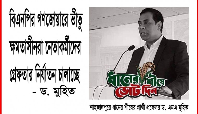 শাহজাদপুর প্রতিনিধি : সিরাজগঞ্জ -৬ (শাহজাদপুর) আসনে ধানের শীষের প্রার্থী প্রফেসর ড. এমএ মুহিত অভিযোগ করেছেন, ‘শাহজাদপুরে বিএনপির গণজোয়ার দেখে ক্ষমতাসীন আওয়ামী লীগ ভীত সন্ত্রস্থ হয়ে পুলিশ দিয়ে বিএনপি নেতাকর্মীদের ধরাও পাকড়াও ও নির্যাতন শুরু করেছে, নির্বাচনের সুষ্ঠু পরিবেশ ব্যাহত করছে। তারা নীল নকশার নির্বাচন করতে চায়। এরই ধারাবাহিকতায় আজ শুক্রবার সকাল ১১ টায় আমার বাড়িতে নির্বাচনী কার্যক্রম পরিচালনার সময় পুলিশ বাড়ি ঘিরে ফেলে শাহজাদপুর উপজেলা বিএনপির সাধারণ সম্পাদক ইকবাল হোসেন হিরু ও যুগ্ম- সাধারণ সম্পাদক আরিফুজ্জামান আরিফকে গ্রেফতার করেছে। গত ২/৩ দিনে উপজেলার খুকনী, মোল্লাপাড়া, রূপনাই, এনায়েতপুর ব্যাংক মোড়, সৈয়দপুর, হাট প্রাচীল, কৈজুরী, জগতলা, গুপিয়াখালী, জামিরতা বাজার, কাশিপুর, বর্ণিয়া, ভেড়াখোলাসহ শাহজাদপুর নির্বাচনী এলাকায় পথসভা ও গণসংযোগে হাজার হাজার সাধারণ জনগণের স্বতস্ফূর্ত অংশগ্রহন ও ধানের শীষের গণজোয়ার দেখে ক্ষমতাসীনেরা দিশেহারা হয়ে পড়েছে। যতই বিএনপি নেতাকর্মীদের গ্রেফতার নির্যাতন চালানো হোক না কেনো; ঐক্যবদ্ধভাবে জনগণকে সাথে নিয়ে ক্ষমতাসীনদের সকল অপচেষ্টা প্রতিহত করা হবে।’ আজ শুক্রবার দুপুরে শাহজাদপুর উপজেলার হাবিবুল্লাহনগর ইউনিয়নের শ্রীফলতলাস্থ নিজ বাসভবনে স্থানীয় গণমাধ্যমকর্মীদের কাছে দেয়া ব্রিফিংয়ে এ অভিযোগ করেছেন ড. এমএ মুহিত। এ সময় তিনি শাহজাদপুরবাসীর উদ্দেশ্যে বলেন, সন্ত্রাসী কার্যকলাপ করে দলীয় নেতাকর্মীদের নির্যাতন, পুলিশ দিয়ে গ্রেফতার করে আর ধানের শীষের গণজোয়ার আটকানো যাবে না। ৩০ ডিসেম্বর সারাদিন নির্বাচনে ব্যালটের মাধ্যমে জনগণ এর সমুচিত জবাব দেবে। এজন্য দলীয় নেতাকর্মীদের ঐক্যবদ্ধভাবে সকল পরিস্থিতি মোকাবেলার আহবান জানান তিনি।