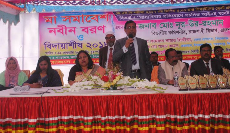 নিজস্ব প্রতিনিধি:শাহজাদপুর উপজেলার গাড়াদহ বালিকা উচ্চ বিদ্যালয়ে আজ বৃহস্পতিবার দুপুরে যৌতুক ও বাল্যবিবাহ রোধে মা-সমাবেশ অনুষ্ঠিত হয়। এতে প্রধান অতিথি ছিলেন,রাজশাহী বিভাগীয় কমিশনার মোঃ নূর-উর-রহমান। বিশেষ অতিথি ছিলেন,সিরাজগঞ্জ জেলা প্রশাসক কামরুন নাহার সিদ্দীকা ও শাহজাদপুর উপজেলা চেয়ারম্যান প্রফেসর আজাদ রহমান। শাহজাদপুর উপজেলা নির্বাহী অফিসার শেহেলী লায়লার সভাপতিত্বে অনুষ্ঠিত এ সমাবেশে বক্তব্য রাখেন,উপজেলা ভাইস চেয়ারম্যান মুস্তাক আহমেদ,মহিলা ভাইস চেয়ারম্যান এলিজা খান,মাধ্যমিক শিক্ষা অফিসার আব্দুল কাদের বিশ্বাস, প্রধান শিক্ষক আলহাজ্ব আব্দুস সাত্তার প্রমূখ। এ সমাবেশে প্রায় ২ হাজার মা ও শিক্ষার্থী যৌতুক ও বাল্যবিবাহকে না করে শপথ নেন। প্রধান অতিথি রাজশাহী বিভাগীয় কমিশনার মোঃ নূর-উর-রহমান তাদের এ শপথ বাক্য পাঠ করান। এ সমাবেশে বাল্যবিবাহ বিষয়ক বিতর্ক প্রতিযোগীতা,কৃতি শিক্ষার্থীদের সংবর্ধনা,নবীণদের বরণ ও আসন্ন এসএসসি পরীক্ষার্থীদের আনুষ্ঠানিক ভাবে বিদায় জানানো হয়। এ ছাড়া সমাবেশ শেষে বার্ষিক পুরস্কার বিতরণ ও মনোজ্ঞ সাংস্কৃতিক অনুষ্ঠান পরিবেশন করা হয়।