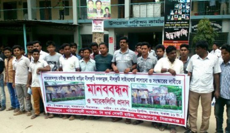 নিহাল খান, শাহজাদপুর : আজ ২৭ এপ্রিল বুধবার সকাল ১১ টায় বিশ্বকবি রবীন্দ্রনাথ ঠাকুরের স্মৃতিধন্য শাহজাদপুর রবীন্দ্র কাছারি বাড়ির নীলকুঠি দখলমুক্ত, আবাসিক সাইনবোর্ড সরিয়ে নীলকুঠির সাইনবোর্ড লাগানো ও সংস্কারের দাবিতে পরিবেশবাদী সংগঠন দি বার্ড সেফটি হাউজ এর উদ্দোগে সিরাজগঞ্জ জেলার শাহজাদপুর উপজেলায় উপজেলা পরিষদ চত্বরে মানববন্ধন ও স্মারকলিপি প্রদান অনুষ্ঠিত হয়েছে । দি বার্ড সেফটি হাউজের উদ্দোক্তা সাংবাদিক মামুন বিশ্বাসের সভাপতিত্বে এই মানবন্ধন অনুষ্ঠিত হয়। এছাড়া মানববন্ধনে একাত্রতা প্রকাশ করে শাহজাদপুর উপজেলা ভাইস চেয়ারম্যান মুস্তাক আহমেদ, উপজেলা আওয়ামীলীগ নেতা সিলিং হক,ইসলাম শেখ, কলেজ ছাত্রলীগ এর রাসেল শেখ, হুমায়ন প্রতিক, আকাশ হোসেন, মমিন আহমেদ, স্কুল ও কলেজের শীক্ষার্থীগণ, সাংবাদিকবৃন্দ সহ সর্বস্তরের মানুষ অংশগ্রহণ করে। মানববন্ধনে সকলের একটাই দাবি ছিল- অতি দ্রুত শাহজাদপুর এর রবীন্দ্র কাছারি বাড়ির নীলকুঠি সংস্কার করে দর্শানার্থীদের জন্য উন্মুক্ত করে দেয়া হোক। এছাড়া এ ব্যাপারে তারা মাননীয় প্রধানমন্ত্রীর হস্তক্ষেপ কামনা করেন। মানববন্ধন শেষে শাহজাদপুর উপজেলা নির্বাহী অফিসার জনাব শামীম আহমেদ বরাবর স্মারকলিপি প্রদান করা হয়। উল্লেখ্য যে, শাহজাদপুর রবীন্দ্র কাচারি বাড়ীতে অবস্থিত নীলকুঠি ভবন এখন কাচারী বাড়ীর কর্মকর্তা ও কর্মচারীদের আবাসিক ভবন। এতে করে দেশ বিদেশ থেকে আসা দর্শনার্থীরা নীলকুঠি ভিতরে দেখতে পারছে না এবং এতে তাদের অজানা থেকে যাচ্ছে নীলকুঠি সর্ম্পকে। সরেজমিন ঘুরে দেখা যায় বৃটিশ আমলে নির্মিত নীলকুঠি ভবন জড়াজীর্ন অবস্থায় রয়েছে। নীলকুঠি ভবনের মধ্যেই বসবাস করছে ৯টি পরিবারের প্রায় ৩০জন সদস্য। স্থানীয় রবীন্দ্র প্রেমিদের তাদের দাবি ২৫ শে বৈশাখের আগেই এই নীলকুঠি ভবন উন্মুক্ত করে দিলে বাইরের দর্শনার্থীরা দেখতে পাবে।এই নীল কুঠিভবন থেকেই নীলকরেরা স্থানীয় প্রজাদের ধরে নীল চাষ করাতেন । এই ভবন ছিল নির্যাতনের চিহ্ন। কয়েকজন লোকের কারনে হাজার হাজার দর্শনার্থীরা বঞ্চিত হচ্ছে নীলকুঠির ইতিহাস থেকে।তাই এরই পরিপ্রেক্ষিতে আজ সকাল ১১ টায় পরিবেশবাদী সংগঠন দি বার্ড সেফটি হাউজের উদ্দোগে মানববন্ধন ও স্মারকলিপি প্রদান করা হয়।