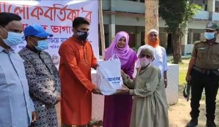 সিরাজগঞ্জের শাহজাদপুরে সুবিধা বঞ্চিত দরিদ্র ৩০০ পরিবারের মাঝে ঈদ উপহার সামগ্রী বিতরণ করেছে সামাজিক সংগঠন আলোকবর্তিকা। আজ সোমবার (১০মে) সকাল ১০টায় শাহজাদপুর মডেল সরকারি পাইলট হাইস্কুল প্রাঙ্গনে ৩'শ পরিবারের প্রতিনিধির মাঝে প্রধান অতিথি হিসেবে উপস্থিত থেকে ঈদ উপহার সামগ্রী বিতরণের উপদ্বোধন করেন, শাহজাদপুর উপজেলা নির্বাহী অফিসার শাহ মোঃ শামসুজ্জোহা। বিশেষ অতিথি হিসেবে উপস্থিত ছিলেন, শাহজাদপুর মডেল সরকারি পাইলট হাইস্কুলের প্রধান শিক্ষক মোঃ সাইফুল ইসলাম। জানা যায়, শাহজাদপুর মডেল সরকারি পাইলট হাইস্কুলের শিক্ষিকা সুমনা শিমু প্রায় ২ বছর পূর্বে অত্র স্কুলের ছাত্রছাত্রীদের নিয়ে অসহায়, দরিদ্র ও দুস্থ্য মানুষের সহযোগীতা করার লক্ষ্যে আলোকবর্তিকা নামে একটি সামাজিক সংগঠন প্রতিষ্ঠা করেন। আলোকবর্তিকা প্রতিষ্ঠার পর থেকে বিভিন্ন সময় ব্যাক্তিগত ও ছাত্রদের অর্থায়ানে শিক্ষিকা সুমনা শিমু অসহায় জনগোষ্ঠীকে খাদ্য সামগ্রী দিয়ে সহযোগীতা করে আসছে। চলতি রমজান মাসেও তাদের নিজস্ব অর্থায়নে প্রতিদিন প্রায় ২ থেকে ৩ শতাধিক রোজাদারের মাঝে ইফতার সামগ্রী বিতরণ করছেন। এসময় শাহজাদপুর উপজেলা নির্বাহী অফিসার শাহ মোঃ শামসুজ্জোহা বলেন, আলোকবর্তিকা যেভাবে মানুষের কল্যাণে কাজ করে যাচ্ছে সেটা ইতিবাচক। আমি এর উ্দ্দোক্তা সুমনা শিমুকে ধন্যবাদ জানাই। সবাই যদি যার যার অবস্থান থেকে এভাবে এগিয়ে আসে তাহলে আমাদের দেশের বিভিন্ন দুর্যোগ মোকাবেলা সহজ হয়ে যাবে। আলোকবর্তিকার প্রতিষ্ঠাতা শাহজাদপুর মডেল সরকারি পাইলট হাইস্কলের শিক্ষিকা সুমনা শিমু বলেন, আলোকবর্তিকা প্রতিষ্ঠা করা হয়েছে সমাজের অবহেলিত, সুবিধা বঞ্চিত, দুস্থ্য, দরিদ্র ও অসহায় মানুষকে সহযোগীতা করার লক্ষ্যে। আমাদের সংগঠনের মাধ্যমে এখন পর্যন্ত করোনা কালীন সহযোগীতা, শীতবস্ত্র বিতরণ, গতবছর ঈদ উপহার বিতরণ, প্রতিদিন ইফতার ও বিভিন্ন রকম সহযোগীতা বিতরণ করা হয়েছে। আমাদের এই কার্যক্রমের ধারাবাহিকতা অব্যহত থাকবে।