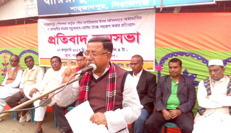 শাহজাদপুর প্রতিনিধি : শাহজাদপুর পৌরসভা কর্তৃক নাগরিকদের ওপর অবৈধভাবে অস্বাভাবিক ও অসহনীয় মাত্রায় হোল্ডিং ট্যাক্স আরোপ করায় আজ শুক্রবার বিকেলে শাহজাদপুর কাপড়ের হাট প্রাঙ্গণে এক প্রতিবাদ সভা অনুষ্ঠিত হয়েছে। শাহজাদপুর পৌর নাগরিক স্বার্থরক্ষা সংগ্রাম কমিটির উদ্যোগে নবগঠিত কমিটির আহবায়ক শফিকুজ্জামান শফি’র সভাপতিত্বে অনুষ্ঠিত ওই সভায় এলাকার বিশিষ্ট ব্যবসায়ী, সাংবাদিকসহ বিভিন্ন শ্রেণি-পেশার নাগরিকবৃন্দ অংশগ্রহন করেন। ওই সভায় অন্যান্যের মধ্যে বক্তব্য রাখেন, শাহজাদপুর প্রেসক্লাবের সভাপতি বিমল কুন্ডু, শাহজাদপুর উপজেলা বণিক সমিতির সাধারণ সম্পাদক রবিন আকন্দ, সিরাজগঞ্জ জেলা জাসদের সাংগঠনিক সম্পাদক হাসানুজ্জামান তুহিন, শাহজাদপুর উপজেলা জাসদের সাধারণ সম্পাদক আবু হাসান খান মনি, ব্যবসায়ী নেতা আলহাজ্ব সিরাজুল ইসলাম, আব্দুর রকিব সরকার, শাহজাদপুর তাঁত কাপড় ব্যবসায়ী সমিতির সভাপতি আলমাছ আনছারী, শাহজাদপুর উপজেলা তাঁত শ্রমিক ইউনিয়নের সাধারণ সম্পাদক আল মাহমুদ, অগ্নিবীণা সংসদের আহবায়ক আনিছুর রহমান মনোয়ার, সাবেক সাধারণ সম্পাদক আইয়ুব আলী, আলহাজ্ব হায়দার আলী, উপজেলা স্বেচ্ছাসেবক লীগের যুগ্ম আহবায়ক ফারুক সরকার প্রমূখ। সভায় বক্তারা অবিলম্বে পুনর্মূল্যায়নের মাধ্যমে হোল্ডিং ট্যাক্স সহনীয় মাত্রায় পুনঃনির্ধারণের জোর দাবি জানান। এছাড়া, পৌর নাগরিকদের জন্ম নিবন্ধন, জন্ম সনদ, মৃত্যু সনদ, ওয়ারিশান সনদ প্রাপ্তিতে পৌর নাগরিকদের জিম্মি করে অবৈধভাবে জোরপূর্বক হোল্ডিং ট্যাক্স পরিশোধ করতে বাধ্য করা হচ্ছে- এ ঘটনার তীব্র নিন্দা জানিয়ে বলেন, ‘আগামী ৭ দিনের মধ্যে দাবি মানা না হলে শাহজাদপুরে হরতালসহ লাগাতার আন্দোলন কর্মসূচী পালন করা হবে।’ ওই সভায় স্থানীয় ব্যবসায়ী মহল, সুধীমহলসহ বিভিন্ন শ্রেণি পেশার মানুষ স্বতস্ফূর্তভাবে অংশগ্রহন করেন।