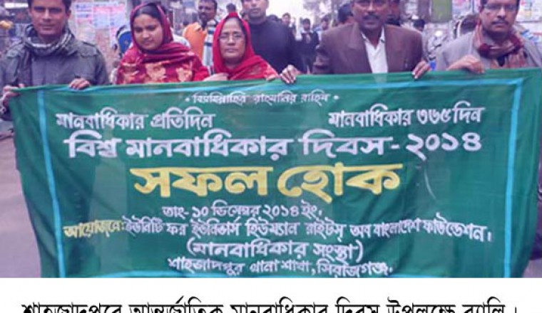 শাহজাদপুর প্রতিনিধিঃ ‘মানবাধিকার প্রতিদিন- মানবাধিকার ৩৬৫ দিন’ এই শ্লোগানকে সামনে রেখে শাহজাদপুরে পালিত হল আন্তর্জাতিক মানবাধিকার দিবস- ২০১৪। ‘ইউনিটি ফর ইউনিভার্স হিউম্যান রাইটস্ অব বাংলাদেশ ফাউন্ডেশন’ শাহজাদপুর থানা শাখার উদ্যোগে আজ বুধবার সকালে এক বিশাল র্যালি বের করা হয়। স্থানীয় প্রেসক্লাব চত্বর থেকে র্যালিটি বের হয়ে পৌর শহরের বিভিন্ন সড়ক প্রদক্ষিণ শেষে উপজেলা পরিষদ চত্বরে গিয়ে শেষ হয়। র্যালি পূর্ববর্তী অনুষ্ঠানে বক্তব্য রাখেন, ইউনিটি ফর ইউনিভার্স হিউম্যান রাইটস্ অব বাংলাদেশ ফাউন্ডেশন (মানবাধিকার সংস্থা) এর শাহজাদপুর থানা শাখার সাধারণ সম্পাদক সাংবাদিক আবুল কাশেম, সহ-সাধারণ সম্পাদক কেএম খালেকুজ্জামান, ক্রীড়া বিষয়ক সম্পাদক নাসির উদ্দিন প্রমুখ। অনুষ্ঠানে বক্তরা বলেন, আমাদের সমাজে প্রতিনিয়ত মানবাধিকার লঙ্ঘিত হচ্ছে। জাতিসংঘের মানবাধিকারের সনদে স্বাক্ষরিত দেশগুলোর মধ্যে বাংলাদেশ অন্যতম। তাই সেই অঙ্গীকারাবদ্ধতায়ই আমাদেরকে সর্বদায় খেয়াল রাখতে হবে যাতে করে আমাদের সমাজে কোন মানবাধিকার লঙ্ঘিত না হয়। আর এজন্য মানবাধিকার লঙ্ঘিত’র শিকারে পরিণত ব্যক্তির পাশে দাঁড়ানো সহ ‘ইউনিটি ফর ইউনিভার্স হিউম্যান রাইটস্ অব বাংলাদেশ ফাউন্ডেশন’ শাহজাদপুর থানা শাখা মানবতার পক্ষেই কাজ করতে সদা সচেতন থাকবে।