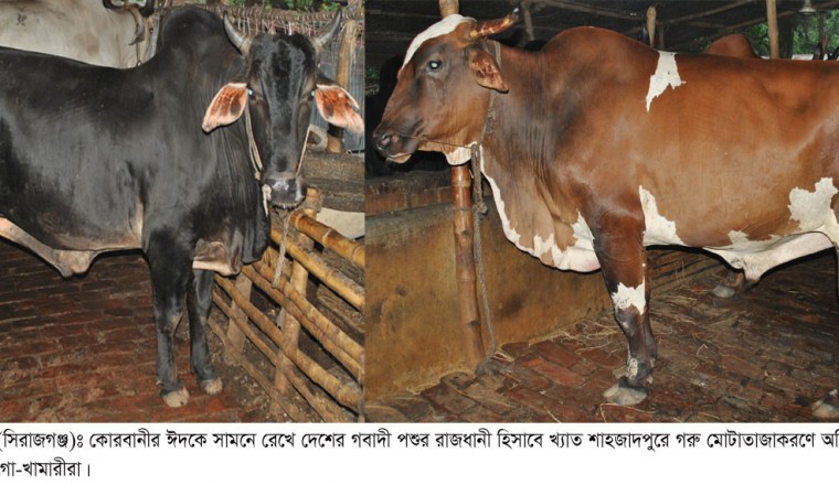 নিজস্ব প্রতিবেদকঃ কোরবানীর ঈদকে সামনে রেখে দেশের নিউজিল্যান্ডখ্যাত জনপদ ও গবাদীপশুর রাজধানীখ্যাত শাহজাদপুর উপজেলাসহ পার্শ্ববর্তী বিভিন্ন স্থানে গরু মোটাতাজাকরণে হাজার হাজার গো-খামারীরা অতি ব্যতিব্যাস্ত সময় অতিবাহিত করছেন। অত্যন্ত লাভজনক হওয়ায় এ অঞ্চলে গরু মোটাতাজাকরণে গো-খামারীদের সংখ্যা দিন দিন বৃদ্ধি পাচ্ছে। কোরবানীর ঈদে দেশে গরুর চাহিদার সিংহভাগ শাহজাদপুর,সিরাজগঞ্জ জেলাসহ বাঘাবাড়ী মিল্কশেড এরিয়া থেকে সরবরাহ করা হয়ে থাকে। প্রতি বছরই ঢাকার গাবতলীর গরুর হাটসহ দেশের বিভিন্ন কোরবানীর হাটে শাহজাদপুরসহ বাঘাবাড়ী মিল্কশেড এরিয়া থেকে লাখ লাখ গরু নিয়ে যাওয়া হয় শাহজাদপুর থেকে। কোরবানীর ঈদকে উপলক্ষ করেই বর্তমানে এ অঞ্চলের হাজার হাজার গো-খামারীরা গরু মোটাতাজাকরণে অতি ব্যতিব্যস্ত সময় অতিবাহিত করছে। শাহজাদপুর, চৌহালী, বেলকুচি, উল্লাপাড়া, তাড়াশ, কাজিপুরসহ সিরাজগঞ্জের বিভিন্ন গ্রামাঞ্চলে শত শত বেকার বৈজ্ঞানিক পদ্ধতিতে স্বল্প সময়ে অল্প টাকা বিনিয়োগে ৬ থেকে ১০ মাসের মধ্যে দেশী ও বিদেশী বিভিন্ন জাতের গরু বাণিজ্যিক ভিত্তিতে মোটাতাজাকরণ করে দারিদ্র জয় করে স্বাবলম্বী হয়েছেন।এক সময়ে কিছুই ছিলনা তাদের।একে অন্যের দেখাদেতিতে দেশী ও বিদেশী জাতের বাছুর লালন পালন করে তারা আজ স্বনির্ভরশীল। মাত্র ৬ থেকে ১০ মাসে বাড়ির অন্যান কাজের পাশাপাশি মাত্র ৩/৪ টি ষাঢ় গরু বৈজ্ঞানিক পদ্ধতিতে মোটাতাজাকরন করে লাখ লাখ টাকা আয় করে বেকার অনেকেই এক দৃষ্টান্তমূলক নজির স্থাপন করেছেন। তাদের সাফল্যগাথা বাস্তব এ কাহিনী শুনতে কল্পবাক্য মনে হলেও অনেক সময় বাস্তবতা কল্পনাকেও হার মানায় , তারই প্রমাণ মিললো শাহজাদপুর উপজেলার বিভিন্ন গ্রামের গরু মোটাতাজাকরন খামারীদের সাথে কথা বলে। জানা গেছে, দেশের গবাদীপশুর রাজধানী শাহজাদপুরে আধুনিক ও বৈজ্ঞানিক পদ্ধতি অবলম্বনে বানিজ্যিক ভিত্তিতে সব চেয়ে বেশী গরু মোটাতাজাকরণ হয় টেপরি ও পুরান টেপরি গ্রামে। এছাড়া উপজেলার পোতাজিয়া, রেশমবাড়ী, আঙ্গারু, বৃআঙ্গারু, বাড়াবিল, রুপবাটি, রাউতারা, পোরজনা, পুঠিয়া, ডায়া, নগরডালা, কাকুরিয়া, কাদাইবাদলা, চিথুলিয়া, কাশিনাথপুর, বনগ্রাম, সরিষাকোল, মশিপুর, নুকালী, শেলাচাপড়ী, চরাচিথুলিয়া, ভাইমারা, বহলবাড়ী, আহম্মদপুর, বিন্নাদায়ের, মাদলা, টিয়ারবন্দ, শাকতোলা,বিলকলমীসহ বিভিন্ন বসতবাড়ী ও গো-খামারে বানিজ্যিক ভিত্তিতে গরু মোটাতাজাকরণে এলাকার হাজার হাজার গো-খামারীরা মহাব্যস্ত সময় কাটাচ্ছে। শাহজাদপুরসহ সিরাজগঞ্জ জেলার বিভিন্ন উপজেলার বেকার অনেক এলাকাবাসী মাত্র ১৮ থেকে ২৫ হাজার টাকা দিয়ে দেশী ও বিদেশী জাতের ফ্রিজিয়ান,শাহীওয়াল,দেশী শংকর,অষ্ট্রেলিয়ান,জার্সিসহ বি