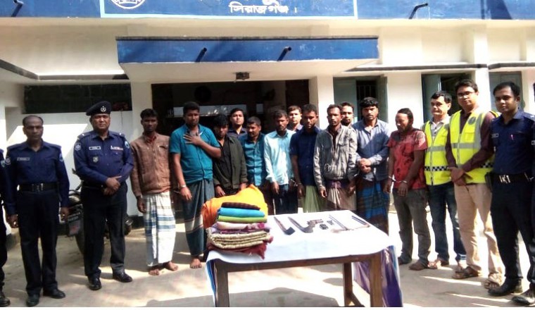 শামছুর রহমান শিশির : ডাকাতি করার প্রস্তুতিকালে গোপন সংবাদের ভিত্তিতে বগুড়া- নগরবাড়ি মহাসড়ক সংলগ্ন শাহজাদপুর উপজেলার পৌর এলাকার দ্বাবাড়িয়া গ্রামের হাইওয়ে রোড সংলগ্ন বাইপাস রাস্তা থেকে ডাকাতির কাজে ব্যবহৃত একটি প্রাইভেট কার ও ২ রাউন্ড গুলিসহ ১টি অত্যাধুনিক সচল বিদেশী রিভলবার, ২টি চাইনিজ কুড়াল, ডাকাতি করার সরঞ্জাম, বেশ কিছু ডাকাতি করা মালামালসহ ৯ ডাকাতকে গ্রেফতার করেছে শাহাজদপুর থানা পুলিশ। গত শনিবার রাতে গোপন সংবাদের ভিত্তিতে শাহজাদপুর থানার অফিসার ইনচার্জ মোঃ খাজা গোলাম কিবরিয়ার নেতৃত্বে থানার পুলিশ পরিদর্শক (তদন্ত) কেএম রাকিবুল হুদাসহ থানা পুলিশের বিশেষ একটি দল জীবন বাঁজি রেখে ওই স্থানে অভিযান চালিয়ে দেশি, বিদেশি অস্ত্র, ডাকাতিকৃত মালামালসহ ৯ ডাকাতকে গ্রেফতার করে । গ্রেফতারকৃত অান্তঃজেলা দলের ডাকাত সদস্যরা হলো শাহজাদপুর উপজেলার সোনাতুনী ইউনিয়নের কুরসি গ্রামের সোনাউল্লাহ ছেলে সবুজ উল্লা (৩৫), ছোট চাঁমতারা গ্রামের মোহাম্মাদ আলীর ছেলে পাষান (৩০), চৌহালী উপজেলার চরসাধা গ্রামের আব্দুল হাই এর ছেলে নুর ইসলাম (৪৫), শৈলজানা গ্রামের হাতেম আলীর ছেলে মোহাম্মদ আলী (৪৫), টাঙ্গাইল জেলার দেলদুয়ার থানার সানবাড়ী গ্রামের ফিরোজ মিয়ার ছেলে আরিফুল ইসলাম (৩০), মানিকগঞ্জ জেলার দৌলতপুর থানার খলিশাডহরা গ্রামের লাল মিয়ার ছেলে এমারত আলী ওরফে চুক্কা (৩৮), উয়াইল গ্রামের আঞ্জু শেখের ছেলে এলাহী (৪০), একই গ্রামের আঃ আজিজের ছেলে শহীদ মিয়া (৪০) ও হাটাইল গ্রামের কুদ্দুস আলীর ছেলে রোস্তম (৪৫)। এ ঘটনায় গ্রেফতারকৃত ৯ ডাকাতসহ অজ্ঞাত আরও কয়েক জনকে আসামফ করে শাহাজদপুর থানায় ৩৯৯/৪০২ ধারা ও ১৮৭৮ সালের আর্মস এ্যাক্ট এর ১৯ এ ধারায় দুটি পৃথক মামলা দায়ের করেছে পুলিশ। আজ রবিবার দুপুরে গ্রেফতারকৃত ডাকাতদের সিরাজগঞ্জ কোর্টে চালান করেছে শাহজাদপুর থানা পুলিশ। এ ব্যাপারে শাহজাদপুর থানা অফিসার ইনচার্জ মো: খাজা গোলাম কিবরিয়া জানান, গোপন সংবাদের ভিত্তিতে অভিযান চালিয়ে এসব কুখ্যাত ডাকাত চক্রকে গ্রেফতার করতে সক্ষম হয়েছি। গ্রেফতারকৃত ৯ ডাকাতের বিরুদ্ধে দেশের বিভিন্ন স্থানের বিভিন্ন থানায় অসংখ্য ডাকাতি ও অপহরনের মামলা রয়েছে।' এদিকে, জীবন বাঁজি রেখে দেশি বিদেশি অস্ত্রসহ আন্তজেলা ডাকাত দলের সক্রিয় ৯ সদস্যকে ডাকাতি করার পূর্বেই গ্রেফতারে সক্ষম হওয়ায় শাহজাদপুর থানা পুলিশকে সাধুবাদ জানিয়েছে শাহজাদপুরবাসী।
