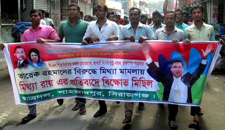 শাহজাদপুর প্রতিনিধিঃ শহিদ রাষ্ট্রপতি জিয়াউর রহমান ও বিএনপি চেয়ারপার্সন, সাবেক প্রধানমন্ত্রী দেশনেত্রী বেগম খালেদা জিয়ার জৈষ্ঠ্য পুত্র তারেক রহমানের নামে মিথ্যা মামলা দায়ের ও ঘোষিত রায়ের বিরুদ্ধে শাহজাদপুর উপজেলা ও পৌর ছাত্রদলের উদ্যোগে রোববার সকালে পৌরসদরে বিক্ষোভ মিছিল বের হয়।উক্ত বিক্ষোভ মিছিলে উপস্থিত ছিলেন, শাহজাদপুর উপজেলা ছাত্রদল নেতা, শাহজাদপুর সরকারি কলেজ ছাত্র সংসদের সাবেক এজিএস হুমায়ুন কবির স্বরণ, ছাত্রদল নেতা আব্দুল বাতেন, হুমায়ুন কবির খাঁন রিপন, আরাফাত আলী রবিউল, নাজিম, মিজানুর রহমান মিজান, লেলিনসহ ছাত্রদলের নেতাকর্মী ও সমর্থকবৃন্দ। বিক্ষোভ মিছিলটি শাহজাদপুর উপজেলা বিএনপি দলীয় কার্যালয়ের সামনে থেকে বের হয়ে শহরের প্রধান প্রধান সড়ক প্রদক্ষিণ করে সেখানেই এসে শেষ হয়। পরে, সেখানে আয়োজিত এক সংক্ষিপ্ত প্রতিবাদ সভায় বক্তারা বলেন,‘ আওয়ামী লীগ দেশ থেকে বিএনপি’র নাম নিশানা নিশ্চিহ্ন করতে চায়। ওই চক্রান্তেরই নীল নকশা বাস্তবায়ন করতে বিএনপি’র সিনিয়র ভাইস চেয়ারম্যান তারেক রহমানের বিরুদ্ধে উদ্দেশ্য প্রণোদিত ও পরিকল্পিতভাবে যে রায় ঘোষিত হয়েছে, তা অবিলম্বে প্রত্যাহার করতে হবে। ওই রায় প্রত্যাহার করা না হলে কঠোর আন্দোলনের মধ্য দিয়ে তা আদায় করতে আওয়ামী লীগকে বাধ্য করা হবে।’