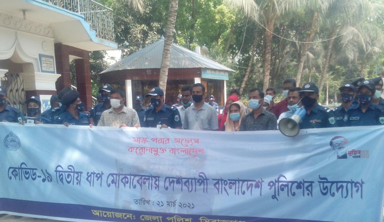 'স্বাস্থ্য বিধি মেনে চলি, করোনা মুক্ত দেশ গড়ি। মুজিব বর্ষের অঙ্গীকার, পুলিশ হবে জনতার।'- এ শ্লোগানকে সামনে রেখে সোমবার (২২ মার্চ) সকালে করোনার ২য় ধাপ মোকাবেলায় শাহজাদপুর থানা পুলিশের উদ্যোগে সচেতনতামূলক শোভাযাত্রা অনুষ্ঠিত ও মাস্ক বিতরণ করা হয়েছে। এদিন সকালে সচেতনতামূলক শোভাযাত্রাটি থানা চত্বর থেকে বের হয়ে পৌর এলাকার প্রধান প্রধান সড়ক ও কোর্ট চত্বর প্রদক্ষিণ শেষে থানা চত্বরেই গিয়ে শেষ হয়। শোভাযাত্রা চলাকালে মাস্কবিহীন অসংখ্য পথচারীদের মাস্ক পরিয়ে দেয় থানা পুলিশের সদস্যবৃন্দ। জনসচেতনতামূলক এ শোভাযাত্রায় অন্যান্যের মধ্যে অংশ নেন শাহজাদপুর উপজেলা পরিষদের ভাইস চেয়ারম্যান মোঃ লিয়াকত আলী, অতিরিক্ত পুলিশ সুপার (শাহজাদপুর সার্কেল) হাসিবুল ইসলাম, থানার অফিসার ইনচার্জ শাহিদ মাহমুদ খান, ওসি (তদন্ত) কমল কুমার দেবনাথ, ওসি (ওপারেশন এন্ড কমিউনিটি পুলিশিং) আব্দুল মজিদ, পৌর কাউন্সিলর আল মাহমুদ, আবু শামীম সূর্য, আব্দুর রউফ, জহরলাল শেখ, নাজমুল হোসেনসহ থানা পুলিশের সকল এসআই, এএসআই ও পুলিশ সদস্যবৃন্দ। পরে সংক্ষিপ্ত বক্তব্যে থানার অফিসার ইনচার্জ শাহিদ মাহমুদ খান বলেন, 'করোনার ১ম ধাপে পুলিশ সম্মূখসারির যোদ্ধা হিসেবে কাজ করেছে। এবার ২য় ধাপে জনগণের মধ্যে সচেতনতা সৃষ্টিতে বিট পুলিশিংয়ের মাধ্যমে প্রচার প্রচারণার উদ্যোগ নেয়া হয়েছে। এ কাজে সকলের সহযোগীতা কাম্য!' শাহজাদপুর থানা পুলিশের জনসচেতনতামূলক উক্ত কর্মসূচি শাহজাদপুর সংবাদ ডটকমের উদ্যোগে সরাসরি সম্প্রচার করা হয়।