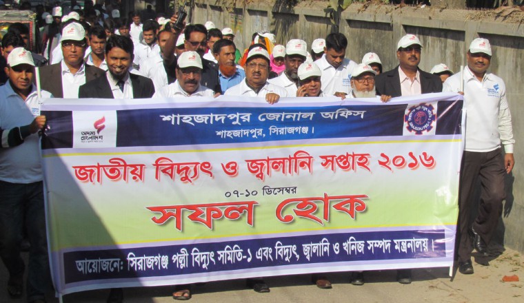 শাহজাদপুর প্রতিনিধি : জাতীয় বিদ্যুত ও জ্বালানী সপ্তাহ-২০১৬ উপলক্ষে গতকাল বুধবার সকালে সিরাজগঞ্জ পল্লী বিদ্যুত সমিতি শাহজাদপুর জোনাল অফিসের উদ্যোগে পৌর এলাকায় এক বর্ণাঢ্য র্যালি শহর প্রদক্ষিন করে। র্যালি শেষে স্থানীয় পল্লী বিদ্যুত কার্যালয়ে স্থানীয় জোনাল অফিসের ডেপুটি জেনারেল ম্যানেজার জুলফিকার রহমানের সভাপতিত্বে অনুষ্ঠিত সভায় প্রধান অতিথি হিসেবে বক্তব্য রাখেন, উপজেলা পরিষদের চেয়ারম্যান প্রফেসর আজাদ রহমান, উপজেলা নির্বাহী অফিসার আরিফুজ্জামান, ভাইস চেয়ারম্যান মুস্তাক আহমেদ, শিক্ষাবিদ প্রফেসর নাছিম উদ্দিন মালিথা, এ এম আব্দুল আজীজ, শাহজাদপুর থানার উপ-পরিদর্শক মিজানুর রহমান প্রমূখ। বক্তারা বলেন,‘ ঘরে ঘরে বিদ্যুত পৌছে দেয়ার জন্য বর্তমান সরকার বদ্ধপরিকর। সেই লক্ষ্যে গত বছরে শাহজাদপুরে ২০ হাজার নতুন বৈদুতিক সংযোগ প্রদান এবং গত মাসে ৩ হাজার নতুন সংযোগ প্রদান করা হয়েছে। এছাড়া চলতি মাসে প্রায় ৫ হাজার নতুন বৈদ্যুতিক সংযোগ প্রদান করা হবে।’ সভাপতির বক্তব্যে ডিজিএম জুলফিকার রহমান বলেন, ‘ বর্তমান সরকারের অঙ্গীকার ২০১৭ সালের জুনের মধ্যে প্রতিটি ঘরে ঘরে বিদ্যুত সংযোগ প্রদান করা হবে। নতুন সংযোগ প্রত্যাশীরা দালালদের খপ্পরে না পড়ে সরাসরি আমার সাথে যোগাযোগ করার আহবান জানান।