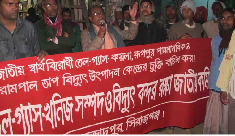 শাহজাদপুর প্রতিনিধিঃ গতকাল সোমবার সন্ধ্যায় শাহজাদপুরে তেল-গ্যাস-খনিজ সম্পদ ও বিদ্যুৎ বন্দর রক্ষা জাতীয় কমিটির উদ্যোগে বিক্ষোভ ও পথসভা অনুষ্ঠিত হয়। বাটার মোড়ে পথসভায় এ দিন বক্তব্য রাখেন বাসদ নেতা এডভোকেট আনোয়ার হোসেন, জাতীয় গণফ্রন্ট নেতা আসাদ আলী ও কাজী শওকত। পথ সভার আগে শাহজাদপুর শহরে এক বিক্ষোভ মিছিল বের করা হয়। বিক্ষোভকারীরা জানান এদেশে জাতীয় স্বার্থ বিরোধি কোন কাজ করতে দেয়া হবে না। পৃথিবীর বৃহত্বর ম্যানগ্রোভ সুন্দরবন ধংস করে যারা বিদ্যুৎ কেন্দ্র গরে তুলতে চায় তাদের বিরুদ্ধে কঠোর আন্দলন গড়ে তোলার জন্য এ দিনের পথসভায় বক্তারা দেশবাশীর প্রতি আহ্বান জানান।