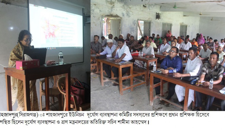 ফারুক হাসান কাহার, শাহজাদপুর (সিরাজগঞ্জ) প্রতিনিধি : শাহজাদপুর উপজেলার ইউনিয়ন দূর্যোগ ব্যাবস্থাপনা কমিটির সদস্যদের দিনব্যাপী শাহজাদপুর সরকারি কলেজ হল রুমে প্রশিক্ষণ কর্মশালা অনুষ্ঠিত হয়েছে। আজ রোববার সকালে দূর্যোগ ব্যবস্থাপনা ও ত্রাণ মন্ত্রণালয়ের আয়োজনে এবং উপজেলা প্রশাসনের সহযোগিতায় দিনব্যাপী প্রশিক্ষন কর্মশালায় প্রধান অতিথি হিসেবে বক্তব্য রাখেন স্থানীয় সাংসদ আলহাজ্ব হাসিবুর রহমান স্বপন, উপজেলা নির্বাহী অফিসার নাজমুল হুসেইন খানের সভাপতিত্বে, আরও বক্তব্য রাখেন উপজেলা চেয়ারম্যান প্রফেসর আজাদ রহমান, উপজেলা প্রকল্প বাস্তবায়ন কর্মকর্তা জিন্দার আলী। এতে প্রধান প্রশিক্ষক হিসেবে উপস্তিত ছিলেন, দুর্যোগ ব্যাবস্থাপনা ও ত্রাণ মন্ত্রনালয়ের অতিরিক্ত সচিব শামীমা আহম্মেদ। এছাড়াও প্রশিক্ষক হিসেবে যুগ্ম সচিব হারুনর রশিদ, উপসচিব নুরুন্নাহারসহ ৫ জন প্রশিক্ষক উপস্তিত ছিলেন।