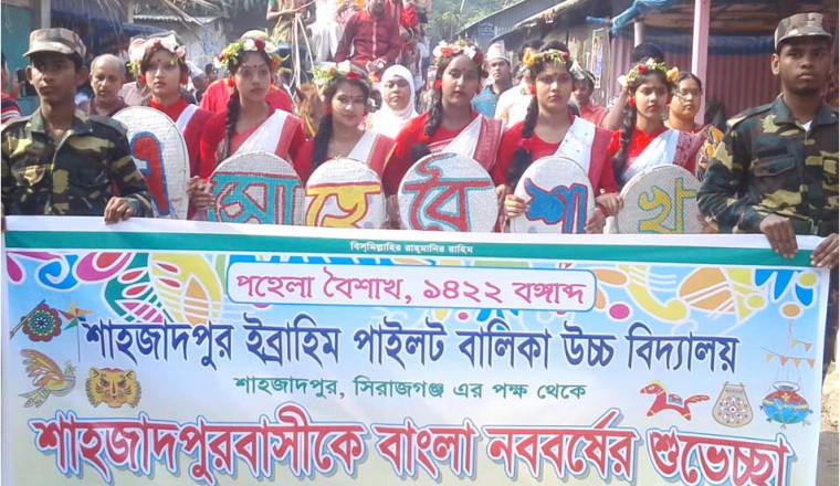 মোঃ মুমীদুজ্জামান জাহান : আজ পহেলা বৈশাখ মঙ্গলবার ১৪২২ বঙ্গাব্দ। স্থানীয় সংসদ সদস্য জনাব হাসিবুর রহমান স্বপনের উদ্যোগে বিশাল আয়েজনে শাহজাদপুরে দিনটি নানা অনুষ্ঠানের মধ্য দিয়ে পালিত হচ্ছে। অনুষ্ঠানের মধ্যে ছিল সকালের মঙ্গল শোভা যাত্রা। ঘোড়ার গাড়ীতে চড়ে স্থানীয় সংসদ সদস্যের নেতৃত্বে মঙ্গল শোভা যাত্রাটি শুরু হয়। ঘোড়ার গাড়ীতে চড়ে এ মঙ্গল যাত্রায় অংশ নেন উপজেলা চেয়ারম্যান অধ্যাপক আজাদ রহমান, ভাইস চেয়ারম্যান মোস্তাক আহমেদ, মহিলা ভাইস চেয়ারম্যান এলিজা খান ও উপজেলা নির্বাহী অফিসার শামীম আহমেদ। বেশ কয়েকটি ঘোড়ারগাড়ীতে চেপে এবং পদব্রজে মঙ্গল যাত্রায় অংশ নিয়েছিল দলীয় নেতাকর্মী স্কুলের শিক্ষক-শিক্ষয়ত্রী, বিভিন্ন স্কুলের ছাত্রছাত্রীসহ উচ্চবিত্তের মানুষেরা। শাহজাদপুর পাইলট হাইস্কুল এর মাঠে তৈরি মঞ্চে ধারাবাহিক ভাবে চলছে সাংস্কৃতিক অনুষ্ঠান। দেশে বিভিন্নস্থান থেকে আসা স্বনামধন্য টিভি ও বেতার শিল্পিরা পরিবেশন করছেন নানাধর্মী সঙ্গীত। সকাল থেকেই শাহজাদপুর পাইলট হাইস্কুল মাঠে পান্তা-ইলিশ ভোজের আয়োজন করা হয়েছে। এর জন্য বরিশাল থেকে আনা হয়েছিল কয়েকমন ইলিশ মাছ। প্রায় ১০ মন চাউলের ভাত রান্না করে পানি দিয়ে তৈরী করা হয়েছে পান্তাভাত।সকাল থেকেই দলের নেতাকর্মিরা পেটপুরে পান্তাভাত খাচ্ছে। শাহজাদপুরে এবছরের পহেলা বৈশাখের ব্যাক্রিমধর্মী এই আয়োজন অনেকটা সামন্ত রাজাকেও হার মানিয়েছে।