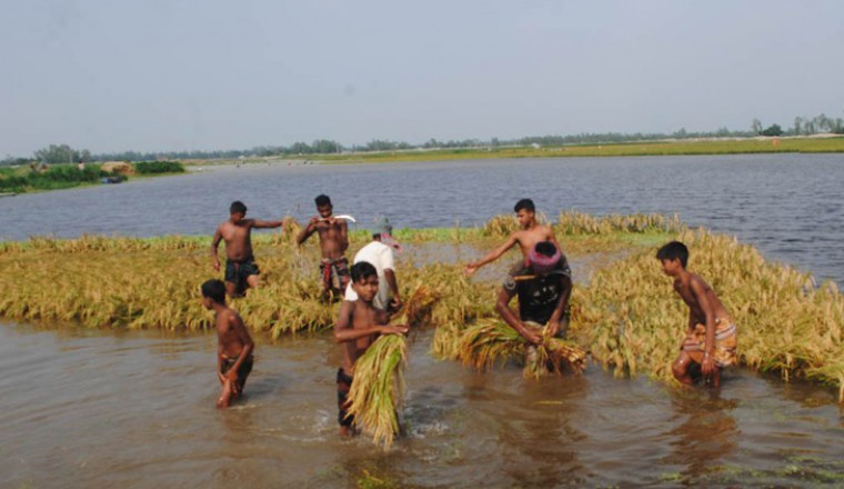 গত কয়েক দিনের প্রবল বৃষ্টি ও উজানের ঢলে সিরাজগঞ্জের শাহজাদপুর উপজেলার যমুনাসহ সবগুলো নদীর পানি বৃদ্ধি পেয়েছে। এতে শাহজাদপুর উপজেলার পৌর এলাকাসহ ১৩টি ইউনিয়নের নিচু এলাকার বেশ কিছু স্থানে আগাম বন্যার পানি ঢুকে ও বৃষ্টিতে জলাবদ্ধতার সৃষ্টি হয়ে প্রায় ২০০ হেক্টর জমির পাকা ধান ডুবে গেছে। কৃষকরা হাঁটু, কোমর ও বুক সমান পানিতে নেমে জমির পাকা ধান কেটে ঘরে তোলার চেষ্টা করছেন। অপরদিকে রবিবার ভোরে উপজেলার পোরজনা ইউনিয়নের নন্দলালপুর নিমাইগাড়ি এলাকায় বাঁধ ভেঙে যাওয়ায় ওই এলাকার ৩ বিঘা জমির ধান বন্যার পানিতে ডুবে গেছে। এ ধানকাটা শ্রমিকের তীব্র সংকট দেখা দেওয়ায় করোনায় বাড়িতে বসে থাকা স্কুলকলেজের ছাত্রদের দিয়ে ধান কাটার কাজ করা হচ্ছে। এ বিষয়ে শাহজাদপুর উপজেলার পোরজনা ইউনিয়নের উল্টাডাব গ্রামের সাধু সরকার, নাঈম ইসলাম, রবিউল ইসলাম, কবিরুল ইসলাম, নাফিজ হোসেন, দোলন হোসেন, ইয়ামিন আলী, ইউনুস আলী, লিপটন সরকারসহ অনেকে বলেন, আর ১ সপ্তাহ গেলেই আমাদের এলাকার অধিকাংশ জমির পাকা ধান কাটা হয়ে যেত। কিন্তু হঠাৎ নদ-নদীর পানি বৃদ্ধি ও প্রবল বৃষ্টির কারণে আমাদের অধিকাংশ নিচু জমির পাকা ধান ডুবে গেছে। নিরূপায় হয়ে আমরা পানিতে ডুব দিয়ে পাকা ও আধা পাকা ধান কেটে ঘরে তোলার চেষ্টা করছি। এ ধান না তুলতে পারলে আমাদের সারা বছর অর্ধাহারে অনাহারে থাকতে হবে। এমনিতেই আমরা করোনার কারণে চরম লোকসানে পড়েছি। এর উপর ধান ডুবে যাওয়ায় আমাদের চরম ক্ষতি হয়েছে। এ ক্ষতি কেমন করে পুষিয়ে নেব তা ভেবে পাচ্ছি না। তারা আরও বলেন, হঠাৎ পানিতে ধান ডুবে যাওয়ায় ধানকাটা শ্রমিকের তীব্র সংকট দেখা দিয়েছে। ৫০০ টাকা করে মজুরি দিয়েও ধানকাটা শ্রমিক পাওয়া যাচ্ছে না। ফলে করোনায় গৃহবন্দি স্কুল-কলেজের ছাত্র ও বাড়ির মহিলাদের দিয়ে ধান কাটাতে হচ্ছে। ফলে আমাদের এলাকার নারী, পুরুষ ও শিশুরা ধানকাটার কাজে ব্যস্ত সময় পার করছে। এ বিষয়ে শাহজাদপুর উপজেলা কৃষি অফিসার আব্দুস সালাম জানান, এ উপজেলার প্রায় ২০০ হেক্টর নিচু জমির পাকা ধান ডুবে গেছে। কৃষকরা এ সব ডোবা ধানের অধিকাংশই কেটে ঘরে তুলতে সক্ষম হয়েছেন। ফলে এ উপজেলায় ক্ষতির পরিমাণ কম হবে।