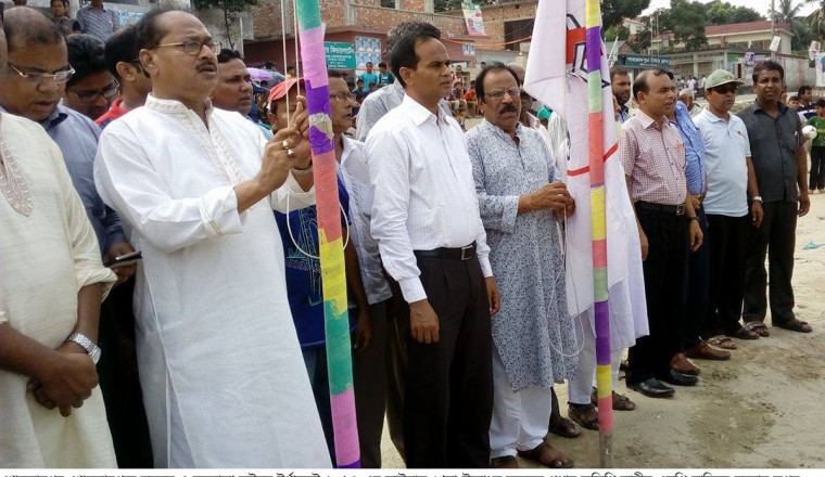 শাহজাদপুর (সিরাজগঞ্জ) প্রতিনিধি : গত বৃহস্পতিবার বিকেলে শাহজাদপুর হাইস্কুল মাঠে শাহজাদপুরে উপজেলা পর্যায়ে বঙ্গবন্ধু ও বঙ্গমাতা বেগম ফজিলাতুন্নেছা মুজিব গোল্ডকাপ প্রাথমিক বিদ্যালয় ফুটবল টুর্ণামেন্ট-২০১৭ এর ফাইনাল খেলা অনুষ্ঠিত হয়েছে। উক্ত ফাইনাল খেলায় যুগ্নীদহ সরকারি প্রাথমিক বিদ্যালয় মহিলা একাদশ গুদিবাড়ি সরকারি প্রাথমিক বিদ্যালয় মহিলা একাদশকে ৩-০ গোলে পরাজিত করে চ্যাম্পিয়্যান হয়। অপর খেলায় পোতাজিয়া সরকারি প্রাথমিক বিদ্যালয় পুরুষ একাদশ ২-০ গোলে হাটপ্রাচীল সরকারি প্রাথমিক বিদ্যালয় পুরুষ একাদশ পরাজিত করে। ফাইনাল খেলা উপলক্ষে আয়োজিত পুরস্কার বিতরণী অনুষ্ঠানে উপজেলা নির্বাহী অফিসার আলীমুন রাজীবের সভাপতিত্বে প্রধান অতিথি হিসেবে উপস্থিত থেকে বিজয়ী ও বিজীত দলের খেলোয়াড়দের ট্রফি তুলে দেন স্থানীয় সংসদ সদস্য আলহাজ্ব হাসিবুর রহমান স্বপন। এ সময় বিশেষ অতিথি হিসেবে উপস্থিত ছিলেন, উপজেলা পরিষদ চেয়ারম্যান প্রফেসর আজাদ রহমান, শাহজাদপুর সরকারি কলেজের অধ্যক্ষ প্রফেসর মোঃ ওয়াজেদ আলী, ভাইস চেয়ারম্যান মুস্তাক আহমেদ, সহকারী কমিশনার (ভূমি) মোহাম্মদ হাসিব সরকার, উপজেলা আ’লীগের যুগ্ম-সাধারণ সম্পাদক ও কৈজুরী ইউনিয়ন পরিষদ চেয়ারম্যান সাইফুল ইসলাম, উপজেলা শিক্ষা অফিসার ফজলুল হক, সাবেক অধ্যক্ষ এএম আব্দুল আজীজ, প্রফেসর নাছিম উদ্দিন মালিথা, পৌর আওয়ামী লীগের সাধারণ সম্পাদক আমিরুল ইসলাম শাহু, প্রধান শিক্ষক ময়নুল হক সরকার, শিক্ষক উজ্জ্বল হোসেন, শাহীন হোসেন, আব্দুল হামিদ, আলমগীর হোসেন প্রমূখ।