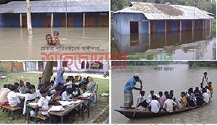 মোঃ মুমীদুজ্জামান জাহান, শাহজাদপুর থেকেঃ উজান থেকে নেমে আসা ঢলে শাহজাদপুরের বন্যা পরিস্থিতি ভয়াবহ রূপ নিয়েছে। উপজেলার ১৩ টি ইউনিয়নের ২ শতাধিক ঘরবাড়ী ও ৬০ টি সরকারি প্রাথমিক বিদ্যালয় বন্যার পানিতে ডুবে গেছে। ডুবে যাওয়া এসব বিদ্যালয়ের শিশু শ্রেণী থেকে ২য় শ্রেণী পর্যন্ত শিক্ষার্থীদের ক্লাস বন্ধ করে দেয়া হয়েছে। তৃতীয় শ্রেণী থেকে পঞ্চম শ্রেণীর শিক্ষার্থীদের অন্যত্র সরিয়ে নিয়ে ক্লাস নেয়া হচ্ছে। ঘর না পাওয়ায় খোলা আকাশের নিচে অনেক স্কুলের ক্লাস নেয়া হচ্ছে। এসব স্কুলগুলি হলো- সাহেবপাড়া, কচুয়া, দামুয়াপাড়া, রাণীকোলা, কৈজুরী, বিনোটিয়া, ভেড়াকোলা, গোপিনাথপুর, ফকিরপাড়া, শিমুলকান্দি, বৃ-হাতকোড়া, সরাতৈল, তারটিয়া, শিবরামপুর, মোহাম্মদপুর, চুলধরি, বাঐখোলা, চরবেলতৈল নতুনপাড়া, রতনদিয়া, ধরজামতৈল, ধরজামতৈল পশ্চিমপাড়া, সরাতৈল চেংটারচর, পূর্বচরবেলতৈল মোল্লাপাড়া, রতনকান্দি উত্তরপাড়া, ঘোরশাল বালক, ঘোরশাল বালিকা, ভেন্নাগাছি, কাদাইবাদলা, চরবাতিয়া, পূর্বখারুয়া, পূর্বচরকৈজুরী, চরবর্ণিয়া, ধলাই, গোপালপুর, মৌকুড়ি, হাটবায়ড়া, দত্তদরতা, জগতলা, বিয়ানপুর গোপিনাথপুর সরকারি প্রাথমিক বিদ্যালয়। এ ব্যাপারে উপজেলা প্রাথমিক শিক্ষা অফিসার আকরারুজ্জমান জানান উজেলার ২২২ টি প্রাথমিক বিদ্যালয়ের অধিকাংশই বন্যার পানিতে ক্ষতিগ্রস্থ হয়েছে। এর মধ্যে ৬০ টি ডুবে গেছে। ঝুকি এড়াতে ডুবে যাওয়া বিদ্যালয় গুলির শিশু শ্রেনী থেকে দ্বিতীয় শ্রেণী পর্যন্ত শিক্ষার্থীরেদর ক্লাস বন্ধ রাখা হয়েছে। এছাড়া আরো অর্ধশতাধিক সরকারি প্রাথমিক বিদ্যালয়ের মাঠ বন্যার পানিতে প্লাবিত হয়েছে। ফলে শিক্ষার্থীদের যাতায়াতে চরম দূর্ভোগ পোহাতে হচ্ছে। অপরদিকে উপজেলার নগরডালা, ডায়া, কৈজুরী, পোরজনা, জামিরতা, জগতলা, গুদিবাড়ী, রূপপুর উড়িরচর, পাড়কোলা, জুগনীদহ, বাড়াবিল, মাদলা, দাবারিয়া, শান্তিপুর, দরগারচর, প্রাণনাথপুর গ্রামের ২ শতাধিক কাঁচাঘরবাড়ী ও ২০ কিলোমিটার কাঁচারাস্তা বন্যার পানিতে ডুবে গেছে। এছাড়া পানিবন্দী হয়ে পড়েছে ৫ হাজার মানুষ। মাঠঘাট ও গোচারন ভূমি বন্যার পানিতে ডুবে যাওয়ায় গো খাদ্যের চরম সংকট দেখা দিয়েছে। বন্যা দূর্গতদের মাঝে এখনও কোন ত্রান সামগ্রী না পৌছায় তারা মানবেতর জীবনযাপন করছে। গতকাল মঙ্গলবার উপজেলা নির্বাহী অফিসার শামীম আহমেদ বন্যা দূর্গত এলাকা পরিদর্শন করেছেন।