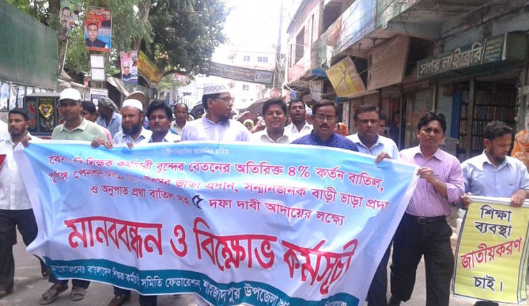 শামছুর রহমান শিশির : অবসর ও কল্যাণ ফ্যান্ডের জন্য ১০ শতাংশ চাঁদা কর্তনের প্রজ্ঞাপন বাতিলের দাবিতে আজ বৃহস্পতিবার শাহজাদপুর বেসরকারি শিক্ষা প্রতিষ্ঠানের শিক্ষক-কর্মচারীরা বিক্ষোভ মিছিল ও উপজেলা পরিষদের সামনে মানববন্ধন সমাবেশ করেছে। প্রায় ঘন্টা ব্যাপি মানববন্ধন কর্মসূচি চলাকালে বক্তব্য রাখেন শাহজাদপুর কলেজ শিক্ষক সমিতির সভাপতি অধ্যক্ষ রুহুল আমিন, জেলা কলেজ শিক্ষক সমিতির সহ-সভাপতি অধ্যক্ষ হায়দার আলী, কলেজ শিক্ষক সমিতির কেন্দ্রীয় সাংগঠনিক সম্পাদক নবী নেওয়াজ এর সঞ্চালনায় মানববন্ধনে আরও বক্তব্য রাখেন কলেজ শিক্ষক সমিতির সাধারণ সম্পাদক অধ্যাপক আব্দুস সালাম, সাংগঠনিক সম্পাদক জসিম উদ্দিন, করতোয়া কলেজের অধ্যাপিকা সৈয়দা নাছিমা জামান, স্কুল শাখার সভাপতি এ্যাডভোকেট হাজী আব্দুল খালেক, সাধারণ সম্পাদক এস, এম, সাইফুল ইসলাম, অধ্যক্ষ শাহাদৎ হোসেন, অধ্যক্ষ আব্দুল মতিন, অধ্যক্ষ কামাল পাশা, অধ্যক্ষ মোস্তাফিজুল হক, অধ্যক্ষ তাহসিন হোসেন, অধ্যক্ষ নিজাম উদ্দিন, প্রধান শিক্ষক ওয়ারেছ আলী, এ কে এম শামিম হোসেন, গোলাম কিবরিয়া, আজমত আলী, পারভেজ আক্তার, আনোয়ার হোসেন প্রমুখ। বক্তারা বলেন, সরকারি শিক্ষক কর্মচারীদের ন্যায় বেসরকারি শিক্ষক কর্মচারীদের ও পূর্ণাঙ্গ পেনশন সুবিধা, পুর্ণাঙ্গ উৎসব ভাতা সম্মানজনক বাড়ি ভাড়া প্রদান, নন এমপিও শিক্ষা প্রতিষ্ঠান ও এমপিও ভূক্ত করন, অধ্যক্ষ, উপাধ্যক্ষ, প্রধান শিক্ষক ও সহ প্রধান শিক্ষক নিয়োগের নতুন বিধিমালা বাতিল করে পূর্বের নিয়মে চালু করার ও কলেজ শিক্ষকদের অনুপাত প্রথা বাতিল করার দাবী জানান। দাবী না মানলে কঠোরতর আন্দোলনের হুমকি দেন শিক্ষকবৃন্দ।