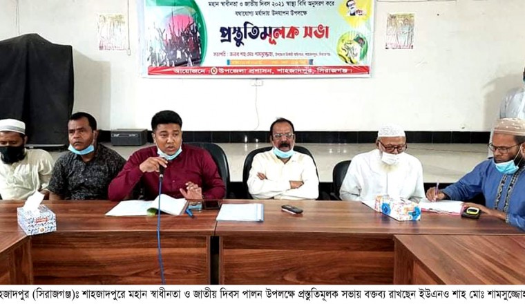 বৃহস্পতিবার দুপুরে শাহজাদপুর উপজেলা পরিষদের শহিদ স্মৃতি সম্মেলন কক্ষে উপজেলা প্রশাসন আয়োজিত মহান স্বাধীনতা ও জাতীয় দিবস স্বাস্থ্যবিধি অনুসরণ করে যথাযথ মর্যাদায় উদযাপন উপলক্ষে এক প্রস্তুতিমূলক সভা অনুষ্ঠিত হয়েছে। শাহজাদপুর উপজেলা নির্বাহী কর্মকর্তা শাহ মোঃ শামসুজ্জোহার সভাপতিত্বে অনুষ্ঠিত উক্ত প্রস্তুতিমূলক সভায় অন্যান্যের মধ্যে উপস্থিত ছিলেন, শাহজাদপুর উপজেলা পরিষদের চেয়ারম্যান প্রফেসর আজাদ রহমান, ভাইস চেয়ারম্যান মোঃ লিয়াকত আলী, সাবেক অধ্যক্ষ এএম আব্দুল আজীজ, উপজেলা প্রকৌশলী আহমেদ রফিকসহ বিভিন্ন সামাজিক ও সাংস্কৃতিক সংগঠনের নেতৃবৃন্দ।
