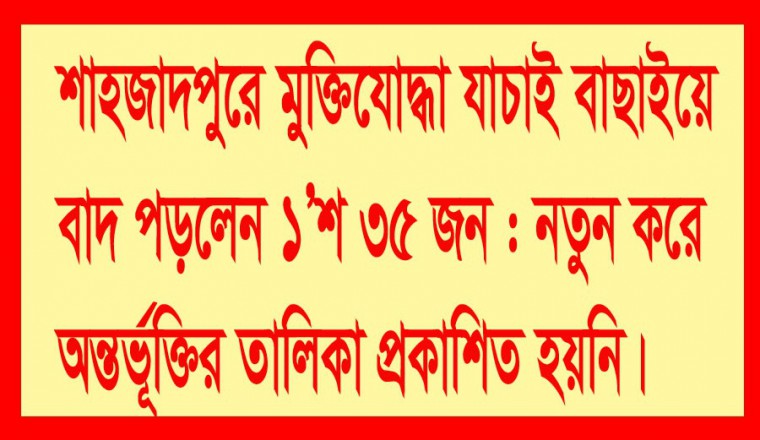 শাহজাদপুর প্রতিনিধি: শাহজাদপুরে মুক্তিযোদ্ধা যাচাই-বাছাইপূর্বক ১’শ ৩৫ জন মুক্তিযোদ্ধা নন- এমন তালিকা প্রকাশ করেছেন মুক্তিযোদ্ধা যাচাই বাছাই কমিটি। উল্লেখ্য গত ১১ ফেব্রুয়ারি মন্ত্রণালয় কর্তৃক যাচাই-বাছাইয়ের নির্ধারিত দিন থাকলেও দুইদফা সময় বাড়িয়ে যাচাই-বাছাই সম্পন্ন করে ১লা মার্চ বাদপড়া তালিকাটি শাহজাদপুর উপজেলা পরিষদের  নোটিশ বোর্ডে টাঙ্গিয়ে দেয়ার কাজটি সম্পন্ন করলেন।  ওই তালিকায় যারা মুক্তিযোদ্ধা যাচাই বাছাইয়ে বাদ পড়েছেন তারাই কেবল অন্তর্ভূক্ত রয়েছেন। যারা নতুন করে মুক্তিযোদ্ধা তালিকায় অন্তর্ভূক্ত হয়েছেন, তাদের তালিকা প্রকাশ করা হয়নি। শাহজাদপুর উপজেলার মুক্তিযোদ্ধা যাচাই বাছাই কমিটি কর্তৃক প্রকাশিত তালিকায় যারা মুক্তিযোদ্ধা তালিকায় অন্তর্ভূক্তিতে বাদ পড়েছেন, সেই তালিকা সূত্রে জানা গেছে, শাহজাদপুর উপজেলার শেরখালী গ্রামের মো : আবুল কালাম আজাদ, মাহফুজুল ইসলাম খান লোদী, নলুয়া গ্রামের মো : মনছের ভূঞা, দ্বারিয়াপুর গ্রামের শামছুজ্জোহা আলমাজি, শক্তিপুর গ্রামের আশরাফুল আলম, বাড়াবিল গ্রামের আব্দুল গফুর মিয়া, শক্তিপুর গ্রামের আমজাদ হোসেন, রামবাড়ী গ্রামের রমজান আলী, ছয় আনীপাড়ার কেএম সাইদুল ইসলাম রাঙ্গা, প্রাননাথপুর গ্রামের নুরুল ইসলাম, রূপপুর পুড়ান পাড়া মহল্লার মৃত মহিউদ্দিন আহমেদ মোন্নেম, দ্বারিয়াপুর গ্রামের আব্দুর রশিদ, আইকবাড়ী পাড়কোলা গ্রামের মুজাম্মেল হোসেন, শাহজাদপুর গ্রামের নজরুল ইসলাম, একই গ্রামের হোসেন আলী মোল্লা, পাড়কোলা গ্রামের তোফাজ্জল হোসেন, শেরখালী গ্রামের নুর হোসেন, শাহজাদপুর গ্রামের মকবুল হোসেন চৌধুরী, দ্বারিয়াপুর গ্রামের হেলাল উদ্দিন, শক্তিপুর গ্রামের মফিজ উদ্দিন শেখ, কান্দাপাড়া গ্রামের হোসেন আলী, পুকুরপাড় গ্রামের মোহাম্মদ আলী খান, কান্দাপাড়া গ্রামের মৃত আলী হোসেন, শক্তিপুর গ্রামের হোসেন আলী, কায়েমপুরের গোবিন্দপুর গ্রামের আব্দুল জলিল খাঁ, চিথুলিয়া গ্রামের খলিল সরকার, বনগ্রামের তয়জাল আকন্দ, চিথুলিয়া গ্রামের আরজান আলী সরকার, ব্রজবালা গ্রামের মৃত গোলবার হোসেন, চিথুলিয়া গ্রামের মোক্তার হোসেন বাবলু, বনগ্রামের সাখোয়াত হোসেন, নলুয়া গ্রামের আহের আলী মোল্লা, দ্বারিয়াপুর গ্রামের তৈমুর ফারুক মুন্না, তালতলা গ্রামের সোনাউল্লাহ মিয়া, পুকুরপাড় গ্রামের আব্দুস শুকুর, বাড়াবিল গ্রামের নুরুল হক, রুপপুর গ্রামের এমদাদুল হক ছাদেম, দ্বারিয়াপুর গ্রামের বাদশা বেপারী, একই গ্রামের মৃত এসএম সামছুজ্জামান বাবলু, দ্বাবারিয়া গ্রামের সাগর বেপারী, ব্রজবালা গ্রামের মন্তাজ আলী, চিনাধুকুরিয়া গ্রামের মরহুম গোলাম হোসেন, বনগ্রামের হুসাইন আলী, হরিরামপুর গ্রামের আবু হানিফ, হলদিয়ার গ্
