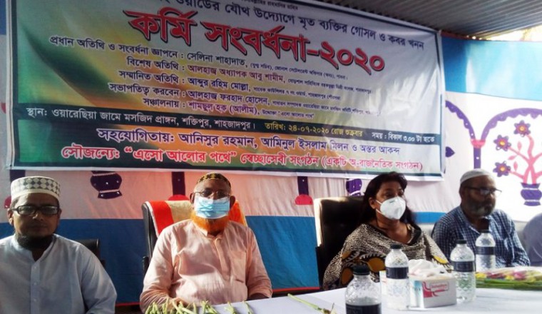 আজ শুক্রবার (২৪ জুলাই) সিরাজগঞ্জের শাহজাদপুর উপজেলার পৌরসভার শক্তিপুরে ৬ ও ৭ নং ওয়ার্ডের উদ্দ্যোগে ও "এসো আলোর পথে" স্বেচ্ছাসেবী সংগঠনের সৌজন্যে আনিসুর রহমান, আমিনুল ইসলাম মিলন ও অন্তর আকন্দর সহযোগিতায়, মৃত ব্যক্তির গোসল ও কবর খনন কর্মি সংবর্ধনা-২০২০ অনুষ্ঠিত হয়েছে। উক্ত অনুষ্ঠানে আলহাজ্ব ফরহাদ হোসেনের সভাপতিত্বে ও "এসো আলোর পথে"র উদ্দোক্তা শামছুল হক আলীমের সঞ্চালনায় প্রধান অতিথি হিসাবে উপস্থিত থেকে বক্তব্য রাখেন ও ১সংবর্ধনা জ্ঞাপন করেন সেলিনা শাহাদাত (যুগ্ম সচিব), জোনাল সেটেলমেন্ট অফিসার (অবঃ), পাবনা, বিশেষ অতিথি হিসাবে উপস্থিত ছিলেন প্রভাষক আলহাজ্ব আবু শামীম, সাবেক কাউন্সিলর আব্দুর রহিম, প্রমুখ। এসময় সংবর্ধনা অনুষ্ঠানে উপস্থিত মৃত ব্যক্তির কবর খনন ও গোসল করানো ১৩ জন মহিলা কর্মি ও ১৩ জন পুরুষ কর্মিকে উপহার হিসাবে ১পিছ শাড়ী, ১ পিছ ওরনা,১টি ছাতা ও ১ পিছ লুঙ্গী তাদের হাতে তুলে দেন, এবং ১৩ জন পুরুষকে দেয়া হয় ১টি লুঙ্গী ১ পিছ পান্জাবী ১পিছ গামছা ১পিছ গেন্জি ও ১টি করে শাড়ী তাদের পরিবারের জন্য তুলে দেন "এসো আলোর পথে"র উদ্দোক্তারা।