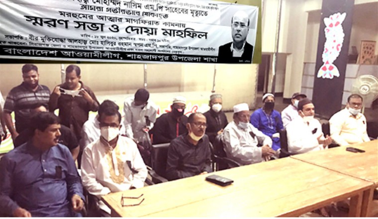 সিরাজগঞ্জের শাহজাদপুরে সাবেক স্বরাষ্ট্র ও স্বাস্থ্যমন্ত্রী এবং বাংলাদেশ আওয়ামীলীগের প্রেসিডিয়াম সদস্য আলহাজ¦ মোহাম্মদ নাসিমের আত্মার মাগফেরাত কামনায় স্মরন সভা ও দোয়া মাহফিল অনুষ্ঠিত হয়েছে । বৃহস্পতিবার সকাল ১০ টায় রবীন্দ্র কাছারিবাড়ি মিলনায়তনে উপজেলা আওয়ামী লীগের আয়োজনে এ স্মরন সভা ও দোয়া মাহফিলে দলীয় নেতাকর্মীসহ বিভিন্ন শ্রেনী পেশাজীবীর মানুষ উপস্থিত ছিলেন। উপজেলা আওয়ামীলীগের সহ-সভাপতি রফিকুল ইসলাম বাবলার সভাপতিত্বে এসময় বক্তব্য রাখেন, উপজেলা আওয়ামীলীগের সাধারন সম্পাদক ও উপজেলা চেয়ারম্যান প্রফেসর আজাদ রহমান, যুগ্ম সাধারন সম্পাদক সাইফুল ইসলাম, সাংগঠনিক সম্পাদক মোস্তাক আহমেদ, আইন বিষয়ক সম্পাদক এড. শেখ আব্দুল হামিদ লাভলুসহ অনেকে। আলোচনা শেষে মরহুমের আত্মার মাগফেরাত কামনা করে দোয়া করা হয়।