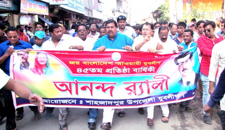 নিজস্ব সংবাদদাতা: বর্ণাঢ্য আয়োজনে দিনব্যাপি নানা কর্মসূচির মধ্যে দিয়ে গতকাল শনিবার শাহজাদপুরে আওয়ামী যুবলীগের ৪৫ তম প্রতিষ্ঠা বার্ষিকী পালিত হয়েছে। এদিন সকালে উপজেলা আওয়ামী লীগ কার্যালয়ে জাতীয় ও দলীয় পতাকা উত্তোলন এবং জাতির পিতা বঙ্গবন্ধু শেখ মুজিবুর রহমানের প্রতিকৃতিতে পুষ্পস্তবক অর্পনের মধ্যে দিয়ে দিনের কর্মসূচি শুরু হয়। সকাল সাড়ে ১০ টায় দলীয় কার্যালয় থেকে এক বর্ণাঢ্য আনন্দ র‌্যালি বের হয়ে পৌর এলাকার বিভিন্ন সড়ক প্রদক্ষিণ করে। র‌্যালি শেষে দলীয় কার্যালয়ে আলোচনা সভা অনুষ্ঠিত হয়। এতে প্রধান অতিথি হিসেবে উপস্থিত ছিলেন কেন্দ্রীয় যুবলীগের প্রেসিডিয়াম সদস্য সাবেক এমপি চয়ন ইসলাম। বিশেষ অতিথি হিসেবে উপস্থিত ছিলেন স্থানীয় আওয়ামী লীগ সাধারণ সম্পাদক ও উপজেলা পরিষদের চেয়ারম্যান প্রফেসর আজাদ রহমান ও কেন্দ্রীয় যুবলীগের আন্তর্জাতিক বিষয়ক সম্পাদক ড. সাজ্জাদ হায়দার লিটন। সভায় সভাপতিত্ব করেন উপজেলা যুবলীগ সভাপতি ইউনুস আলী। এতে অন্যান্যদের মধ্যে বক্তব্য রাখেন উপজেলা ভাইস চেয়ারম্যান মুস্তাক আহমেদ, আওয়ামীলীগ নেতা গোলাম মওলা আজম, পৌর মেয়র নাসির উদ্দিন, আমিরুল ইসলাম শাহু, যুবলীগ সাধারণ সম্পাদক মামুনুর রশিদ লিয়াকত, সাংগঠনিক সম্পাদক হারুন শেখ, যুবলীগ নেতা রাজিব শেখ, শরিফুল ইসলাম মনি, ছাত্রলীগ সাধারণ সম্পাদক ইসলাম শেখ, কামরুল হাসান হিরোক প্রমুখ।