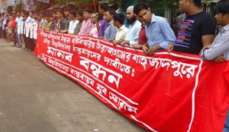 শুক্রবার সকাল ১১ টায় ‘ রবীন্দ্র বিশ্ববিদ্যালয় বাস্তবায়ন যুব ফোরামের’ উদ্যোগে জাতীয় প্রেস ক্লাবের সামনে এক মানব বন্ধন কর্মসূচি পালিত হয় । উক্ত মানব বন্ধন কর্মসূচিতে উপস্থিত সর্ব স্তরের মানুষের পক্ষ থেকে সিরাজগঞ্জের শাহজাদপুরে’ রবীন্দ্র বিশ্ববিদ্যালয় ‘ বাস্তবায়নের জোর দাবি জানান । বক্তারা জানান যে শাহজাদপুরে রয়েছে কবির ১২০০ একর নিজস্ব জায়গা , এছাড়াও রয়েছে উন্নত যোগাযোগ বাবস্থা সহ নয়নভিরাম পরিবেশ ।
