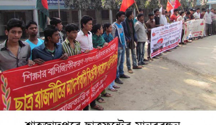 শাহজাদপুর প্রতিনিধিঃ আজ বৃহস্পতিবার সকালে শাহজাদপুরে রবীন্দ্র বিশ্ববিদ্যালয়ের ভিত্তিপ্রস্তর স্থাপন এবং আগামী শিক্ষাবর্ষ থেকে শিক্ষা কার্যক্রম চালু করার দাবিতে উপজেলা পরিষদ সংলগ্ন প্রধান সড়কে এক মানববন্ধন কর্মসূচি পালন করা হয়। মানববন্ধন শেষে উপজেলা পরিষদ চেয়ারম্যান প্রফেসর আজাদ রহমান ও উপজেলা নির্বাহী অফিসার শামীম আহমেদ’র কাছে ছাত্র ফ্রন্টের পক্ষ থেকে স্মারক লিপি পেশ করা হয়। এছাড়া সরকারের শিক্ষা সংকোচন-বাণিজ্যিকীকরণ- সাম্প্রদায়িকীকরণ প্রতিরোধ করে সর্বজনীন বিজ্ঞানভিত্তিক সেক্যুলার একই পদ্ধতির বৈষম্যহীন গণতান্ত্রিক শিক্ষানীতি চালুর দাবিতে নানা কর্মসূচির মধ্যে দিয়ে এ দিন শাহজাদপুরে সমাজতান্ত্রিক ছাত্র ফ্রন্টের ৩১তম প্রতিষ্ঠাবার্ষিকী পালিত হয়েছে। কর্মসূচির মধ্যে ছিল সমাবেশ, র্যালি, মানববন্ধন ও স্মারক লিপি পেশ। সকাল ১১ টায় উপজেলা বাসদ কার্যালয় থেকে ছাত্র ফ্রন্টের এক বিশাল র্যালি বের হয়ে শহরের বিভিন্ন সড়ক প্রদক্ষিণ করেন। র্যালি শেষে উপজেলা পরিষদ চত্বরে সমাবেশ ও মানববন্ধন অনুষ্ঠিত হয়। সমাবেশে সভাপতিত্ব করেন সমাজতান্ত্রিক ছাত্র ফ্রন্ট উপজেলা শাখার সভাপতি আরিফুল ইসলাম। এতে অন্যান্যদের মধ্যে বক্তব্য রাখেন সিরাজগঞ্জ জেলা বাসদের আহবায়ক নব কুমার কর্মকার, উপজেলা বাসদ নেতা এড. আনোয়ার হোসেন, কবীর আজমল বিপুল, ছাত্র ফ্রন্ট নেতা প্রতিক গুন, সবুজ খন্দকার, সুকৃতি আজমল, এমামুল হক, মুকুল আহমেদ, হৃদয় হোসেন প্রমূখ। বক্তারা ছাত্র রাজনীতির আদর্শবাদী বিপ্লবী ধারাকে শক্তিশালী করার আহবান জানান।