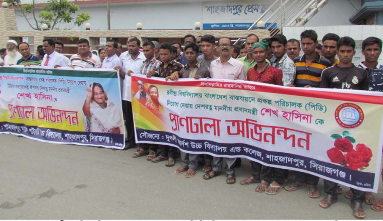 শামছুর রহমান শিশির, শাহজাদপুর থেকে : অবশেষে সকল জল্পনা-কল্পনার অবসান ঘটিয়ে শাহজাদপুর বাসীর দীর্ঘদিনের স্বপ্ন ‘রবীন্দ্র বিশ্ববিদ্যালয়-বাংলাদেশ’ প্রকল্প পরিচালক (পিডি) নিয়োগ দেয়ায় প্রধানমন্ত্রী শেখ হাসিনাকে অভিনন্দন জানিয়ে আজ শুক্রবার দুগলী আদর্শ উচ্চ বিদ্যালয় এন্ড কলেজ ও শাহজাদপুর মডেল পাইলট উচ্চ বিদ্যালয়ের উদ্যোগে পৌর এলাকায় বিশাল আনন্দ র‌্যালি বের করে। র‌্যালি শেষে শাহজাদপুর প্রেস ক্লাব চত্বরে এক সমাবেশ করে বক্তব্য রাখেন, বিদ্যালয়ের ম্যানেজিং কমিটি’র সভাপতি, স্পেশাল পিপি, বাংলাদেশ মিল্ক ইউনিয়নের ভাইস চেয়ারম্যান এ্যাডভোকেট শেখ আব্দুল হামিদ লাভলু, যুবলীগের সাধারণ সম্পাদক মামুনুর রশিদ লিয়াকত, দুগলী আদর্শ উচ্চ বিদ্যালয় এন্ড কলেজে’র অধ্যক্ষ আব্বাস উদ্দিন, শাহজাদপুর মডেল পাইলট উচ্চ বিদ্যালয়ে’র প্রধান শিক্ষক কে,এম, সাইফুল ইসলাম, বাকী বিল্লাহ প্রমুখ। বক্তারা বলেন, শাহজাদপুরবাসী তথা সিরাজগঞ্জ জেলাবাসাীর দীর্ঘদিনের স্বপ্ন শাহজাদপুরে একটি পূর্ণাঙ্গ রবীন্দ্র বিশ্ব বিদ্যালয় স্থাপন। সেই দাবির প্রেক্ষিতে প্রধানমন্ত্রী শাহজাদপুরে আসেন এবং ‘রবীন্দ্র বিশ্ববিদ্যালয় বাংলাদেশ’ ভিত্তি প্রস্তর স্থাপন করেন এবং সম্প্রতি ‘রবীন্দ্র বিশ্ববিদালয় বাংলাদেশ’ বাস্তবায়নের প্রকল্প পরিচালক (পিডি) নিয়োগ করেন। উক্ত সমাবেশে শাহজাদপুরবাসীর পক্ষ থেকে অভিনন্দন জানিয়ে বলেন, ডিজিটাল বাংলাদেশের রুপকার প্রধানমন্ত্রী মুখে যা বলেন তিনি তা বাস্তবায়ন করেন। এদিকে (পিডি) নিয়োগ দেওয়ার খবরে শাহজাদপুরে বইছে আনন্দের জোঁয়ার।