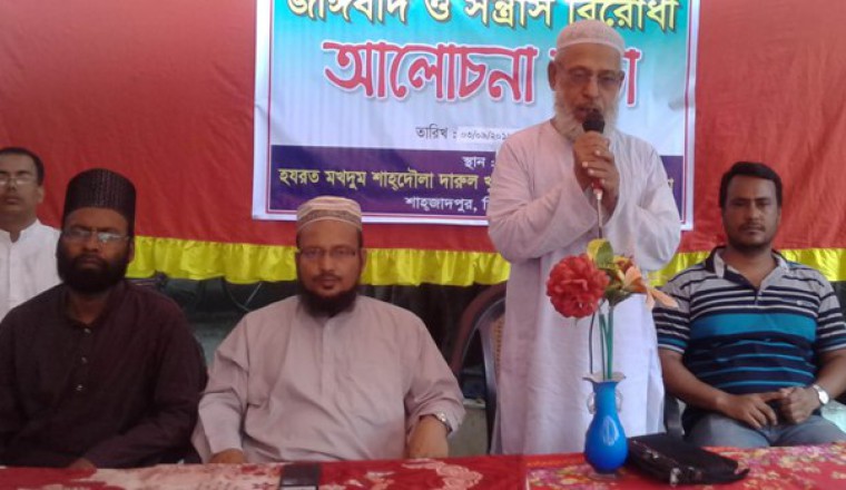 শাহজাদপুর প্রতিনিধি: শনিবার দুপুরে শাহজাদপুর উপজেলার দরগাপাড়া হযরতমখদুম শাহদৌলা দারুল খুলদ ফাজিল (ডিগ্রী) মাদ্রাসা কর্তৃপক্ষ জঙ্গীবাদ ও সন্ত্রাস বিরোধী এক আলোচনা সভার আয়োজন করে। মাদ্রাসা চত্বরে অনুষ্ঠিত এ সভায় সভাপতিত্ব করেন, অধ্যক্ষ মোহাম্মদ আলী। এতে বক্তব্য রাখেন, প্রভাষক আব্দুল আলিম, ছায়েম উদ্দিন মিয়া, খোরশেদ আলম, মোজাফ্ফর হোসেন, নজরুল ইসলাম,রাবেয়া খাতুন প্রমুখ।এ ছাড়া অধ্যক্ষ প্রফেসর আলী হায়দার রেজা তালুকদারের সভাপতিত্বে শাহজাদপুর সরকারী কলেজের হলরুমে আয়োজিত জঙ্গীবাদ ও সন্ত্রাস বিরোধী আলোচনা সভায় বক্তব্য রাখেন, উপাধ্যক্ষ মাহফুজুল ইসলাম, সহকারী অধ্যাপক আব্দুর রাজ্জাক, মাহবুবুর রহমান মিলন, হাবিবুর রহমান, রায়হান আলী, ফিরোজ আলী, কেএম রেজাউল হক, আসমত আলী, সাংবাদিক ম. জাহান, মওলানা আলী আকবর, ছাত্রনেতা প্রতীক আহমেদ প্রমূখ। এ সভা শেষে শিক্ষক ও শিক্ষার্থীরা একযোগে দেশ থেকে চিরতরে জঙ্গীবাদ ও সন্ত্রাসকে রুখে দেয়ার অঙ্গীকার ব্যাক্ত করে শপথ গ্রহণ করেন।