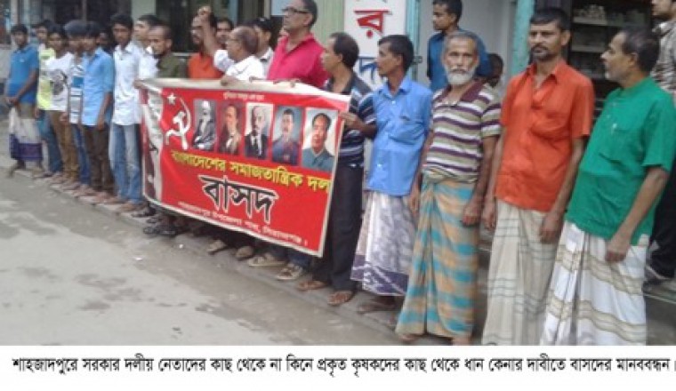 শাহজাদপুর প্রতিনিধিঃ গতকাল শুক্রবার ইফতার পূর্ববর্তী সন্ধ্যায় শাহজাদপুর উপজেরলার পৌর সদরের মনিরামপুর বাজারে এমপির সুপারিশে দলীয় নেতাদের কাছ থেকে ধান ক্রয় বন্ধ, হাটে হাটে ক্রয় কেন্দ্র খুলে প্রকৃত কৃষকের কাছ থেকে সরকার নির্ধারিত মূল্যে ধান ক্রয়ের দাবীতে এক মানববন্ধন ও সংক্ষিপ্ত পথ সভা অনুষ্ঠিত হয়েছে। শাহজাদপুর উপজেলা বাসদ এ মানববন্ধন ও পথসভার আয়োজন করে। এক ঘন্টা ব্যাপী এ মানববন্ধনে উপজেলার বিভিন্ন ইউনিয়ন থেকে শত শত কৃষকরা এসে যোগ দেয়। মানববন্ধন শেষে পথ সভায় বক্তব্য রাখেন,মাহজাদপুরউপজেলা বাসদের সভাপতি এ্যাডভোকেট আনোয়ার হোসেন,কমরেড আব্দুল্লাহ, কমরেড মোহাম্মদআলী চান্নু, কমরেড আব্দুল খালেক,কমরেড মজাম্মেল হক প্রমূখ নের্তৃবৃন্দ। বক্তারা বলেন,শাহজাদপুর সহ সারা দেশে সরকার দলীয় এমপিদের সুপারিশে ও উৎকোচের বিনিময়ে ম্যানেজ হয়ে খাদ্য বিভাগের গুদাম কর্মকর্তারা সরকার দলীয় নেতাদের কাছ থেকে ধান ক্রয় করছে। দলীয় নেতারা চাতাল মালিকদের কাছ থেকে ধান ক্রয় করে ট্রাক দিয়ে তা গুদামে মজুদ করছে। দলীয় এ সব সুবিধা ভোগী নেতাদের কাছ থেকে ধান ক্রয় বন্ধ করে প্রতিটি উপজেলার হাটে হাটে সরকারী ক্রয় কেন্দ্রে খুলে প্রকৃত কৃষকদের কাছ থেকে ধান ক্রয়ের দাবী জানান বক্তারা। এ ছাড়া সকল গুম হত্যা বন্ধ করে মানুষের যান মালের নিরাপত্তা ও ঈদের আগে সকল শ্রমিকদের বেতন-বোনাস পরিশোধের দাবী জানান তারা।