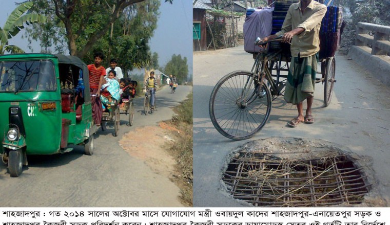 শাহজাদপুর প্রতিনিধি : সিরাজগগঞ্জ জেলার তাঁতসমৃদ্ধ শাহজাদপুর উপজেলার শাহজাদপুর-এনায়েতপুর সড়কের বেহালদশার কারণে দীর্ঘদিন ধরে ৪টি থানার প্রায় ২ লাখ মানুষ চলাচলে চরম দূর্ভোগ পোহাচ্ছে। থানা গুলি হল শাহজাদপুর, এনায়েতপুর, চৌহালি ও বেলকুচি। প্রতিদিন এ সড়ক দিয়ে শতাধিক সিএনজি-টেম্পু, অর্ধশতাধিক নছিমন-করিমন এবং অর্ধশতাধিক বাস ট্রাক ও অন্যান্য যানবাহন চলাচল করে থাকে। সবচেয়ে বেশী দুর্ভোগ পোহাতে হচ্ছে খাজা ইউনুস আলী মেডিকেল কলেজ এন্ড হসপিটালগামী রোগীদের। তারা পথিমধ্যে আরও অসুস্থ হয়ে পড়ছে। ৬ কিলোমিটার দীর্ঘ এ সড়কের অধিকাংশ স্থানে কার্পেট উঠে গিয়ে বড় বড় গর্তের সৃষ্টি হয়েছে। ফলে যাত্রীদের চলাচলে চরম দূর্ভোগ পোহাতে হয়। ভাঙ্গাচোড়া এই সড়ক দিয়ে যানবাহন চলতে গিয়ে প্রায়ই দূর্ঘটনার কবলে পতিত হচ্ছে। এছাড়া হতাহতের ঘটনাও নিত্যনৈমিত্তিক ঘটনায় পরিণত হয়েছে। গত ২০১৪ সালের অক্টোবর মাসে যোগাযোগমন্ত্রী ওবায়দুল কাদের রাস্তাটি পরিদর্শন করে ১ বছরের মধ্যে রাস্তাটি সংস্কারে সংশ্লিষ্টদের নির্দেশ দিলেও, সেই নির্দেশ এখনও বাস্তবায়িত হয়নি। তাঁতসমৃদ্ধ এ অঞ্চলে ৩টি হাটে দেশের দূর-দূরান্ত থেকে ব্যবসায়ীরা আসে কাপড় বেঁচা-কেনা করতে। হাট গুলি হল শাহজাদপুর, সোহাগপুর, এনায়েতপুর কাপড়ের হাট। এ সড়কটি সংস্কারের অভাবে এ সব হাটে বেচা-বিক্রি আগের তুলনায় কমে গেছে। এ সড়ক দিয়ে কাপড়ের গাইট পরিবহণ মুশকিল হয়ে পড়েছে। এলাকাবাসী দীর্ঘদিন ধরে এ সড়কটি মেরাতমের দাবি জানালেও সড়ক ও জনপথ বিভাগ আর্থিক বরাদ্দ না থাকার অজুহাতে জনগুরুত্বপূর্ণ এ সড়কটি মেরামতে গরিমশি করছে। ফলে এলাকাবাসীর মধ্যে দিন দিন অসন্তোষ বাড়ছে। খুকনী গ্রামের ব্যবসায়ী এনামুল হক জানান, প্রতি হাট বারে তার ৩ গাড়ি করে কাপড়ের গাইট হাটে আনা নেওয়া করতে হয়। এ সড়কটি ভেঙ্গে জরাজীর্ণ হয়ে যাওয়ার কারণে আগের চেয়ে তাকে ৩ গুণ ভাড়া বেশি গুনতে হয়। এতে তার ব্যবসায় চরম লোকসান গুনতে হচ্ছে। একই অভিযোগ করেন এনায়েতপুর গ্রামের আব্দুস সামাদ, গুপিনাথপুর গ্রামের গহের আলী, গোপালপুর গ্রামের মজনু মিয়া। অত্যন্ত জনগুরুত্বপূর্ণ এ সড়ক দিয়ে বিশ্বের সর্বাধুনিক প্রযুক্তির চিকিৎসাসেবার স্থান খাজা ইউনুস আলী মেডিকেল কলেজ এন্ড হসপিটালে প্রতিদিন খানা খন্দকের উপর দিয়ে ঝুঁকি নিয়ে অসংখ্য অ্যম্বুলেন্স,শতশত সিএনজি টেম্পু, নসিমন করিমন চলাচল করছে।এ সড়কটি দিয়ে চলাচলকারী যানবাহন চালকদের ভাষ্যমতে, ওই সড়কের বিভিন্ন স্থান দিয়ে অত্যন্ত পরিমিত গতিতে যানবাহন চলাচল করাটাই অত্যন্ত দূরহ হয়ে পড়েছে। ফলে এ জনগুরুত্বপূর্ণ সড়ক দিয়ে চলাচলকারী হাজার হাজার এলাকাবাসীর ১০ মিনিটের রাস্তা পাড়ি দিতে সময় লাগছে