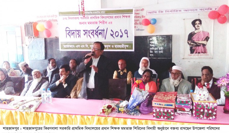 শামছুর রহমান শিশির : আজ রোববার দুপুরে শাহজাদপুরের ঐতিহ্যবাহী ২নং সরকারি প্রাথমিক বিদ্যালয়ের প্রধান শিক্ষক মমতাজ শিরিনের বিদায়ী সংবর্ধনা অনুষ্ঠিত হয়েছে। ওই বিদ্যালয়ের পরিচালনা পরিষদ, সহকারী শিক্ষকবৃন্দ্র ছাত্রছাত্রীদের উদ্যোগে অনুষ্ঠিত সভায় নিয়ামুল ওয়াকিল খান আওরঙ্গের সভাপতিত্বে বিদায়ী সংবর্ধনা অনুষ্ঠানে প্রধান অতিথি হিসেবে বক্তব্য রাখেন, শাহজাদপুর উপজেলা পরিষদের চেয়ারম্যান প্রফেসর আজাদ রহমান। তিনি বলেন, ‘মমতাজ শিরিন একজন আদর্শ শিক্ষক হিসেবে সুনামের সাথে দীর্ঘদিন দায়িত্ব পালন করেছেন। এ সময় অন্যান্যের মধ্যে বক্তব্য রাখেন, উপজেলা দুর্নীতি প্রতিরোধ কমিটির সভাপতি অধ্যক্ষ এএম আব্দুল আজীজ, প্রফেসর নাছিম উদ্দিন মালিথা, ভাইস চেয়ারম্যান মুস্তাক আহমেদ, উপজেলা প্রাথমিক শিক্ষা অফিসার সাইদা সিদ্দীকা, বিদায়ী প্রধান শিক্ষক মমতাজ শিরিন, প্রধান শিক্ষক এসএম সাইফুল ইসলাম, শাহজাদপুর পৌর আওয়ামী লীগের সাধারণ সম্পাদক আমিরুল ইসলাম শাহু, ডাঃ শেফালী খান, প্রধান শিক্ষক মইনুল ইসলাম সরকার, প্রধান শিক্ষক আবু হেনা, প্রধান শিক্ষক মোক্তার হোসেন (অবঃ), রংধনু স্কুলের অধ্যক্ষ শহীদুল ইসলাম শাহীন, ফকরুল মেমোরিয়াল স্কুলের অধ্যক্ষ জাকারিয়া ইসলাম ঠান্ডু, ম্যানেজিং কমিটির সদস্য টিপু সুলতান , কোরবান আলী, আব্দুস সাত্তার খান, ওই স্কুলের শিক্ষক ফরিদা পারভীন, শিরিন নাহার, আফরোজা পারভিন, হাবিবুর নাহার, আলমগীর হোসেন, মাকছুমা পারভীন, আমিনুল ইসলাম, শাপলা ইয়াসমিন, শহিদ হোসেন, রুনা নাসরিন, পাপিয়া খাতুন, ফেরদৌস পারভীন, সবুজ বিপ্লবের উদ্যোক্তা কামরুল হাসান হিরোক প্রমূখ। অনুষ্ঠান সঞ্চালনা করেন সহকারী শিক্ষক উজ্জ্বল হোসেন। স্কুল কর্তৃপক্ষ জানান, বিদায়ী প্রধান শিক্ষক মমতাজ শিরিন ১৯৮৫ সালে সহকারী শিক্ষক হিসেবে শিক্ষাকতা পেশায় আত্মনিয়োগ করেন। পরবর্তীতে ২০০৬ সালে পদোন্নতি পেয়ে তিনি প্রধান শিক্ষক হিসেবে ৩টি স্কুলে সুনামের সাথে দায়িত্বপালন করেন। বিদায়ী প্রধান শিক্ষক মমতাজ শিরিন বলেন, ‘তিনি যখন যে শিক্ষা প্রতিষ্ঠানে চাকুরী করেছেন সেই প্রতিষ্ঠানকে আপন সন্তানের ন্যায় ভালোবেসে পরিচালনা করেছেন। সকল শিক্ষক এভাবেই তাদের স্ব-স্ব শিক্ষা প্রতিষ্ঠানে সন্তানের মতো ভালোবেসে পরিচালনা ও পাঠদান করবেন- সবার প্রতি তার এটাই প্রত্যাশা। পরিশেষে বিদায়ী প্রধান শিক্ষক মমতাজ শিরিন অতিথিবৃন্দকে সাথে নিয়ে ওই বিদ্যালয় চত্বরে একটি বকুল ফুলের চারাগাছ রোপণ করেন।