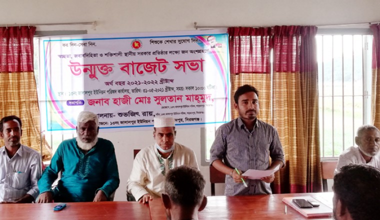সিরাজগঞ্জের শাহজাদপুর উপজেলার ১৩নং জালালপুর ইউনিয়ন পরিষদে ২০২১-২২ ইং অর্থ বছরের উন্মুক্ত খসড়া বাজেট ঘোষণা করা হয়েছে। আজ সোমবার (৩১মে) উপজেলার জালালপুর ইউনিয়ন পরিষদ হলরুমে জালালপুর ইউপি চেয়ারম্যান হাজী মোঃ সুলতান মাহমুদ এর সভাপতিত্বে উক্ত ইউনিয়ন পরিষদের সচিব শুভজিৎ রায় ১ কোটি ২৫ লাখ ৯৯ হাজার ৮’শ ৫২ টাকা আয় এবং ১ কোটি ২৪ লাখ ৬৭ হাজার ১’শ ৬৯ টাকা ব্যায় এছাড়া ১ লক্ষ ৩২ হাজার ৬’শ ৮৩ টাকা উদ্বৃত্ত রেখে বাজেট পেশ করেন। বাজেট ঘোষণাকালে বক্তাগণ সম্ভাব্য বাজেটকে শতভাগ বাস্তবায়ন করার জন্য সকল পর্যায়ের জনগণসহ সংশ্লিষ্ট সকলের সহযোগীতা কামনা করেন। উক্ত বাজেট ঘোষণা অনুষ্ঠানে ইউপি সদস্য মহির উদ্দিন, ছোরমান, আবু মুছা, মোছাঃ শাহেলা, ইউনিয়ন আওয়ামীলীগের সহ-সভাপতি শহিদুল ইসলাম, এনজিও কর্মী, সাংবাদিকবৃন্দ ও অত্র ইউনিয়নের গণ্যমান্য ব্যাক্তিবর্গ উপস্থিত ছিলেন।