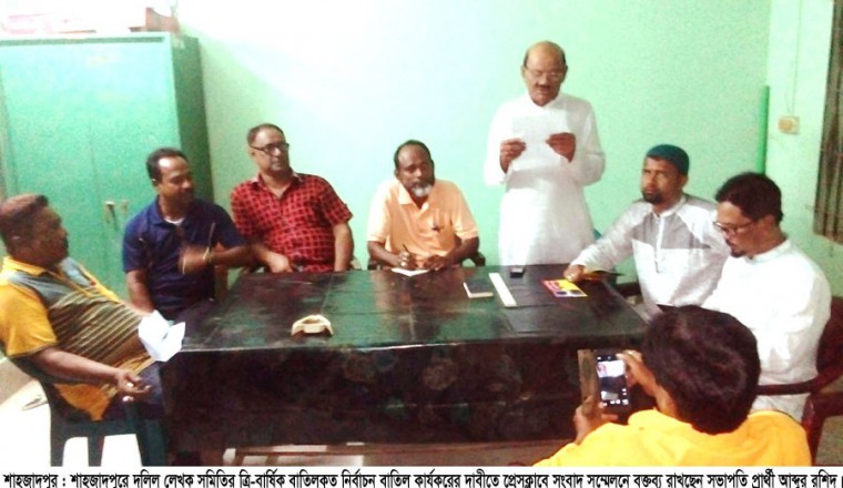 নিজস্ব প্রতিবেদক, শাহজাদপুর : শাহজাদপুরে দলিল লেখক সমিতির বাতিলকৃত ত্রি-বার্ষিক নির্বাচন বাতিল কার্যকরের দাবীতে আজ সোমবার সকালে শাহজাদপুর প্রেসক্লাবে সংবাদ সম্মেলন করেছেন সভাপতি প্রার্থী আব্দুর রশিদ। তিনি তার লিখিত বক্তব্যে জানান, ‘গত ২৪ অক্টোবর (মঙ্গলবার) শাহজাদপুর সাব-রেজিষ্ট্রি অফিসে দলিল লেখক সমিতির ত্রি-বার্ষিক নির্বাচন অনুষ্ঠিত হয়, উক্ত নির্বাচনে তিনি সভাপতি পদপ্রার্থী হিসেবে নির্বাচনে অংশগ্রহন করেন। ওই নির্বাচনে সর্বমোট ভোটার সংখ্যা ছিলো ৯১ জন। তার মধ্যে কাস্টিং ভোট ৮৩ টি। পরবর্তীতে নির্বাচনী ফলাফল ঘোষণার সময় ১০৩ টি ভোটের ফলাফল ঘোষণা করা হয়। সেই মুহুর্তেই তিনি ও সাধারণ সম্পাদক পদপ্রার্থী আলহাজ্ব আবু বক্কার সিদ্দীক তীব্র প্রতিবাদ জানালে এবং ভোট পুন:গণনার দাবী করলে প্রধান নির্বাচন কমিশনার আলহাজ্ব মো: আব্দুর রহমান, সহকারী নির্বাচন কমিশনার আলহাজ্ব ওসমান গণী ও কর্মরত পোলিং অফিসার রানা চৌধুরী এবং সহকারী পোলিং অফিসার সাচ্চু মিয়া ভোট পুন:গণনা করতে অস্বীকার করে তখনই লিখিতভাবে নির্বাচন বাতিল ঘোষণা করেন। শুধু তাই নয়, তার আবেদনের প্রেক্ষিতে উক্ত নির্বাচন কমিশন তার আবেদন পত্রের উপরেও লিখিতভাবে নির্বাচনটি বাতিল ঘোষণা করে স্বাক্ষর প্রদান করেন।’ তিনি নির্বাচন কমিশন কর্তৃক নির্বাচন বাতিলের ওই ঘোষণা কার্যকরের জোর দাবী জানান।