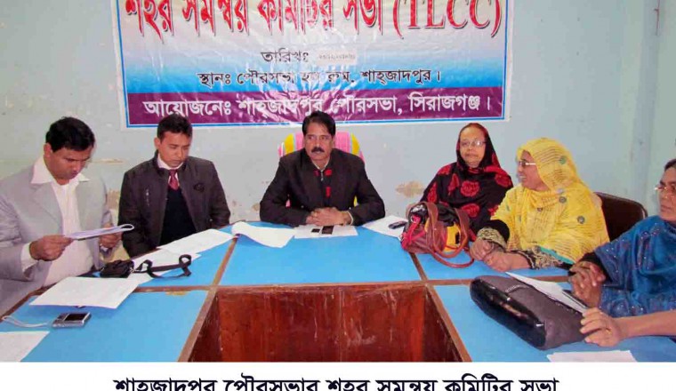 শাহজাদপুর প্রতিনিধিঃ শাহজাদপুর পৌরসভার শহর সমন্বয় কমিটির সভা অনুষ্ঠিত। আজ মঙ্গলবার দুপুরে শাহজাদপুর পৌরসভা মিলনায়তনে মেয়র নজরুল ইসলামের সভাপতিত্বে সভায় বক্তব্য রাখেন, প্যানেল মেয়র লিয়াকত হোসেন, সচিব বেলজুর রহমান খান, কাউন্সিলর ইউনুস আলী, প্রদীপ পোদ্দার, জাহিদুল ইসলাম প্রমূখ। মেয়র নজরুল ইসলাম বলেন, শাহজাদপুর পৌরসভার উন্নয়নে যা যা করণীয় তা আমি করবো। উক্ত সভায় বর্জ্য ব্যবস্থাপনা, জলাবদ্ধতা, ড্রেইনেজ সমস্যা, নারী ও শিশু নির্যাতন, মাদক, যৌতুক ও সীমানা সংক্রান্তসহ নানা বিধ সামাজিক সমস্যা নিয়ে আলোচনা করা হয়।