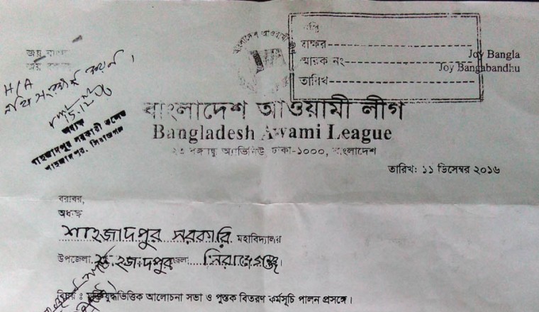 শাহজাদপুর প্রতিনিধি : একটি অনুষ্ঠান সফল করতে ‘কেন্দ্রীয় আওয়ামী একটি লীগের একটি দাপ্তরিক পত্র শাহজাদপুর সরকারি কলেজের অধ্যক্ষকে প্রেরণ করায় এ নিয়ে ওই কলেজের অধ্যক্ষ, শিক্ষকবৃন্দের মধ্যে মিশ্র প্রতিক্রিয়ার সৃষ্টি হয়েছে । এ পত্র দাপ্তরিকভাবে স্থানীয় আওয়ামী লীগ সভাপতি ও সাধারণ সম্পাদক পাননি বলে তারা জানিয়েছেন। এ নিয়ে দলীয় নেতাকর্মীদের মধ্যে মিশ্র প্রতিক্রিয়ার সৃষ্টি হয়েছে। শাহজাদপুর উপজেলা আওয়ামী লীগ নেতারা এখনও এ বিষয়ে কিছুই জানেন না, দু’একজন লোকমুখে শুনেছেন বলে জানিয়েছেন। এ ব্যপারে শাহজাদপুর উপজেলা আওয়ামী লীগ সভাপতি,স্থানীয় এমপি বীর মুক্তিযোদ্ধা হাসিবুর রহমান স্বপন জানান, ‘দাপ্তরিক পত্র দফতর মারফত জানানোর কথা। লোকমুখে শুনেছি। তবে এ ধরনের কোন পত্র এখনও পাইনি।’ অপরদিকে, শাহজাদপুর উপজেলা আওয়ামী লীগের সাধারণ সম্পাদক, উপজেলা পরিষদ চেয়ারম্যান প্রফেসর আজাদ রহমান জানিয়েছেন,‘ এ ব্যাপারে তিনি কিছুই জানেন না।’ এ ব্যাপারে শাহজাদপুর সরকারি কলেজের ভারপ্রাপ্ত অধ্যক্ষ প্রফেসর মুহম্মদ ওয়াজেদ আলী জানিয়েছেন, ‘আগামী ৮ জানুয়ারী রোববার শাহজাদপুর সরকারি কলেজে ‘জাতীর পিতা বঙ্গবন্ধু শেখ মুজিবুর রহমানের বর্ণাঢ্য রাজনৈতিক জীবন এবং বাংলাদেশ আওয়ামী লীগ ও মুক্তিযুদ্ধ শীর্ষক আলোচনা সভা ও মুক্তিযুদ্ধ ভিত্তিক পুরষ্কার বিতরণ কর্মসূচী’ সফল করতে প্রয়োজনীয় ব্যবস্থা গ্রহণের জন্য তাকে পত্র পাঠানো হয়েছে। তবে এ বিষয়ে এখনও কোন সিদ্ধান্ত নেয়া হয়নি। পরবর্তীতে আলোচনা সাপেক্ষে সিদ্ধান্ত নেয়া যেতে পারে।’