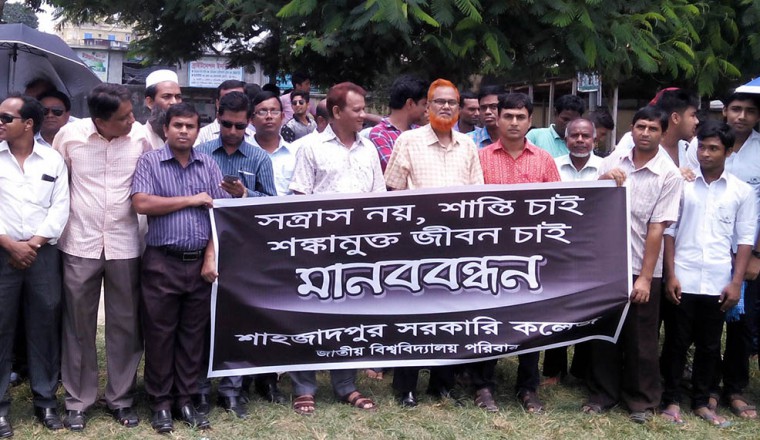 নিজস্ব প্রতিনিধি ঃ আজ সোমবার সকালে সিরাজগঞ্জের শাহজাদপুর সরকারী কলেজ আয়োজিত ১ ঘন্টা ব্যাপী সন্ত্রাস ও জঙ্গী বিরোধী মানব বন্ধন ও সমাশে অনুষ্ঠিত হয়। এতে বক্তব্য রাখেন,শাহজাদপুর সরকারী কলেজের অধ্যক্ষ প্রফেসর আলী হায়দার রেজা তালুকদার, উপাধক্ষ মাহফুজুল ইসলাম,সহকারী অধ্যাপক মাহবুবুর রহমান মিলন,ছাত্রনেতা প্রতীক আহমেদ,আকাশ মিয়া প্রমূখ। অপর এক মানব বন্ধন ও সমাবেশে বক্তব্য রাখেন প্রকৌশলী হাসান জামান, এমদাদুল হক, তাজেদুর রহমান, আজিজুর রহমান, সোহেল রানা প্রমূখ ।
